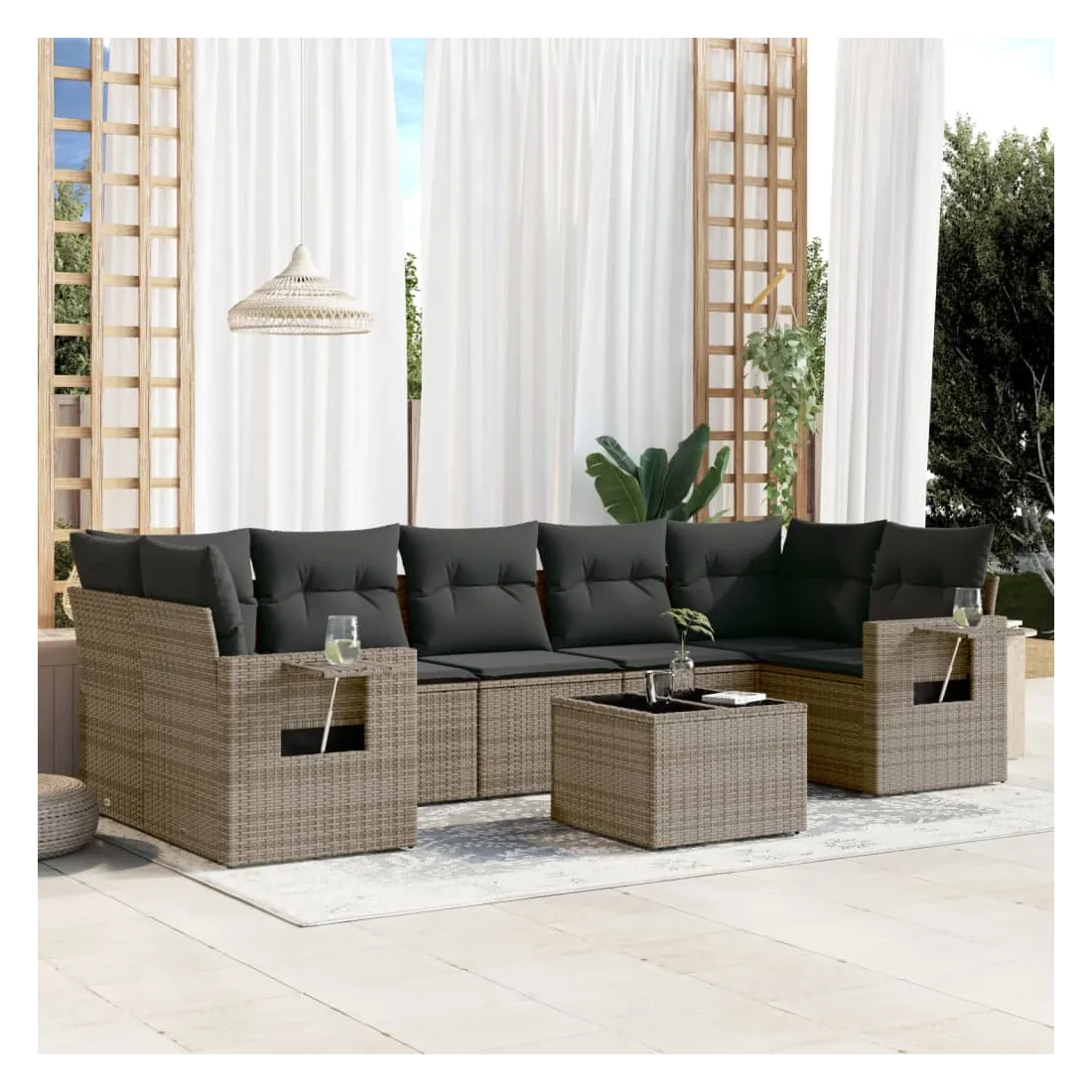 Cet ensemble de canapés de jardin est le complément parfait de votre arrière-cour, terrasse ou patio, offrant un espace confortable et accueillant pour discuter avec la famille et les amis ou simplement se détendre et profiter de l'extérieur. Matériau durable : la résine tressée, également connue sous le nom de poly rotin, est un matériau synthétique solide et nécessitant peu d'entretien qui ressemble au rotin naturel. Il est léger, facile à nettoyer et couramment utilisé pour les meubles d'extérieur en raison de sa durabilité et de ses propriétés de résistance aux intempéries.Dessus en verre : le dessus de la table d'extérieur est fabriqué en verre trempé solide et durable, ce qui le rend facile à nettoyer avec un chiffon humide et ajoute une touche d'élégance à votre espace extérieur. Table d'appoint pratique : ce mobilier d'extérieur comprend des tables d'appoint pliables avec un ressort à gaz sur les accoudoirs, offrant des endroits pratiques pour garder vos essentiels à portée de main. Expérience d'assise confortable : ce mobilier d'extérieur, doté de coussins épais, offre une expérience d'assise confortable.Conception modulaire : cet ensemble de meubles d'extérieur a une conception modulaire, ce qui le rend complètement flexible et facile à déplacer, afin que vous puissiez créer un agencement de meubles d'extérieur personnalisé. Bon à savoir :Pour que vos meubles d'extérieur restent beaux, nous vous recommandons de les protéger avec une housse imperméable.
