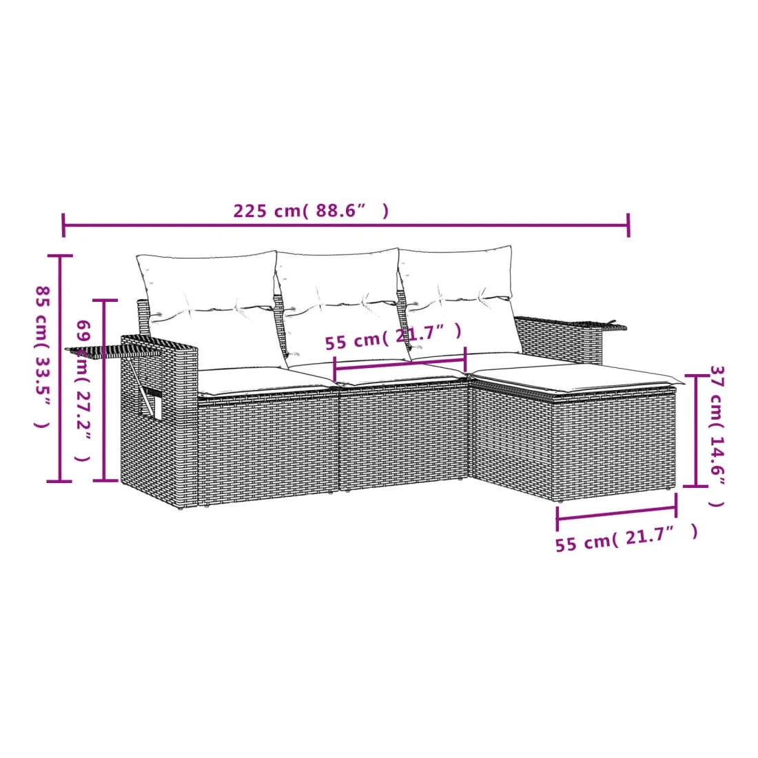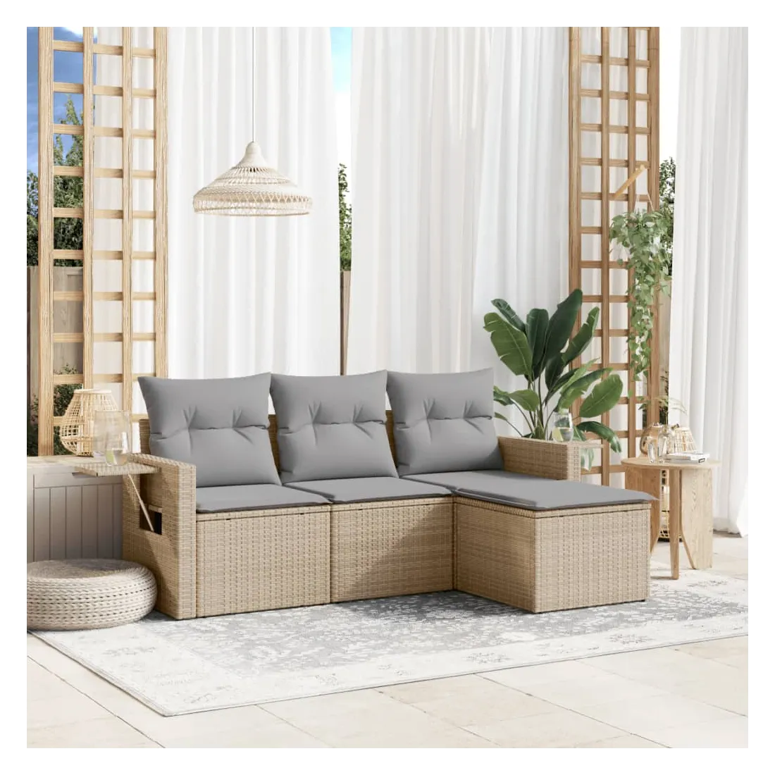 Cet ensemble de canapés de jardin est le complément parfait de votre arrière-cour, terrasse ou patio, offrant un espace confortable et accueillant pour discuter avec la famille et les amis ou simplement se détendre et profiter de l'extérieur. Matériau durable : la résine tressée, également connue sous le nom de poly rotin, est un matériau synthétique solide et nécessitant peu d'entretien qui ressemble au rotin naturel. Il est léger, facile à nettoyer et couramment utilisé pour les meubles d'extérieur en raison de sa durabilité et de ses propriétés de résistance aux intempéries. Table d'appoint pratique : ce mobilier d'extérieur comprend des tables d'appoint pliables avec un ressort à gaz sur les accoudoirs, offrant des endroits pratiques pour garder vos essentiels à portée de main. Expérience d'assise confortable : ce mobilier d'extérieur, doté de coussins épais, offre une expérience d'assise confortable. Housse amovible et lavable : ces coussins de siège sont dotés de housses amovibles pour un lavage et un entretien faciles.Conception modulaire : cet ensemble de meubles d'extérieur a une conception modulaire, ce qui le rend complètement flexible et facile à déplacer, afin que vous puissiez créer un agencement de meubles d'extérieur personnalisé. Bon à savoir :Pour que vos meubles d'extérieur restent beaux, nous vous recommandons de les protéger avec une housse imperméable.