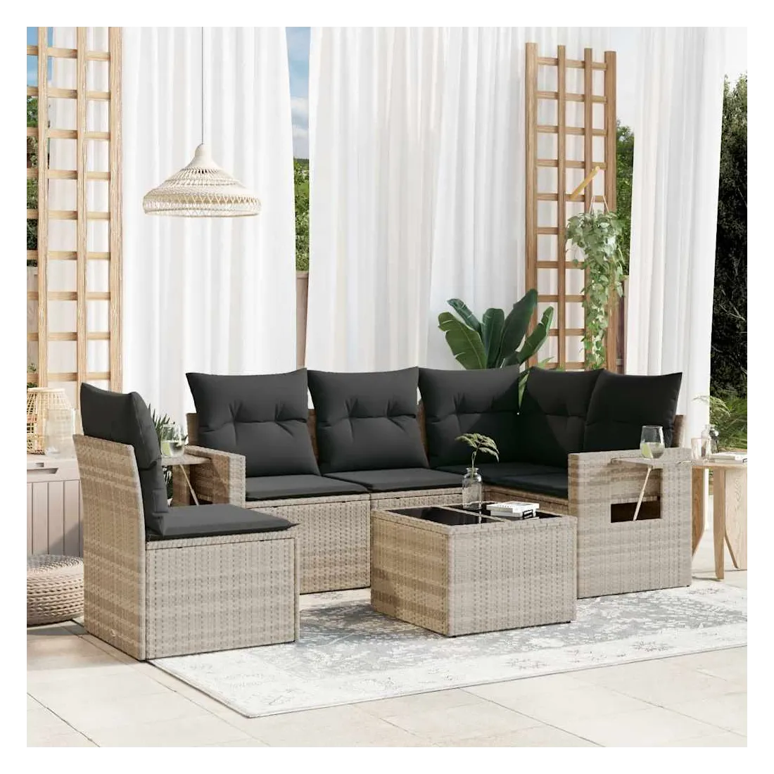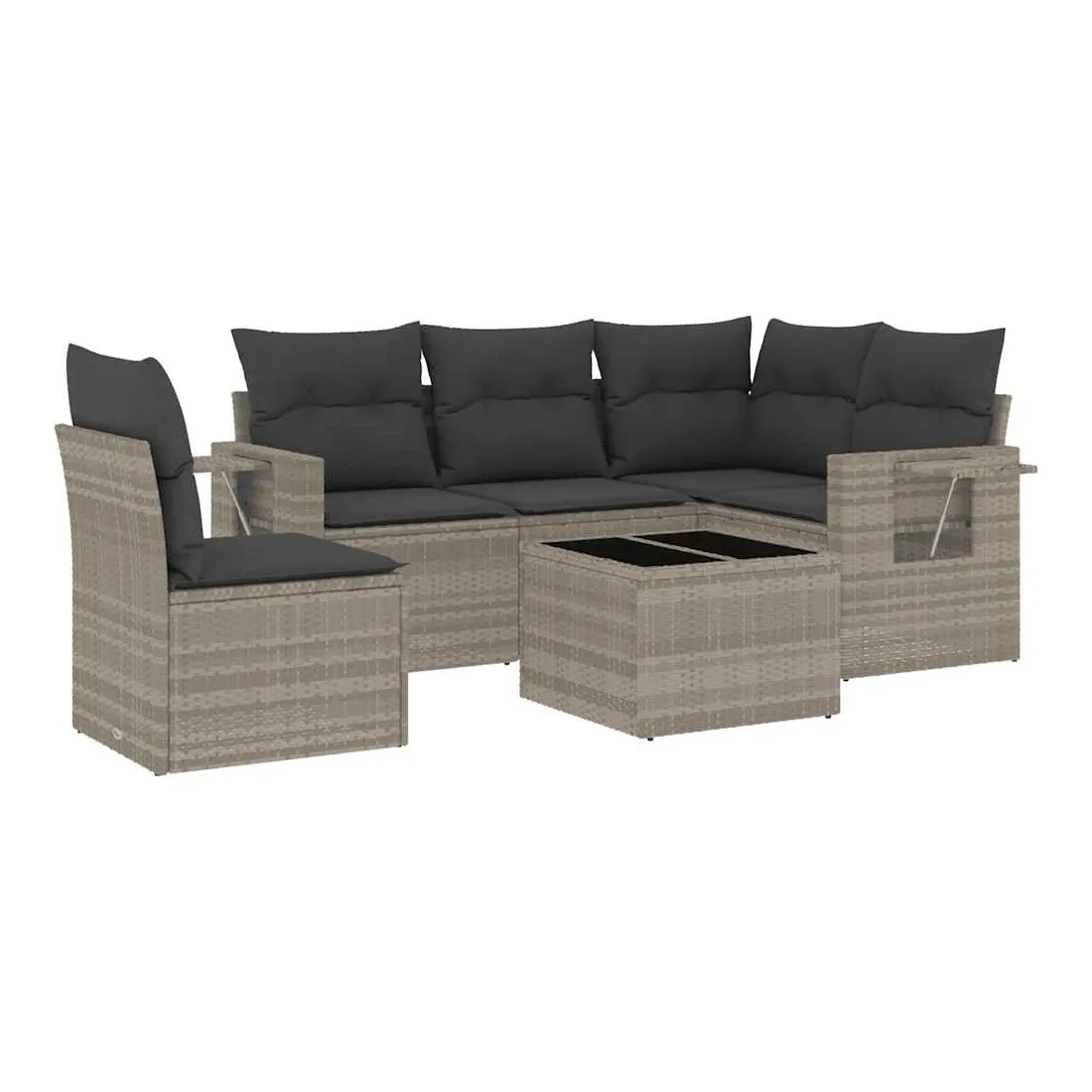 Cet ensemble de canapés de jardin est le complément parfait de votre arrière-cour, terrasse ou patio, offrant un espace confortable et accueillant pour discuter avec la famille et les amis ou simplement se détendre et profiter de l'extérieur. Matériau durable : la résine tressée, également connue sous le nom de poly rotin, est un matériau synthétique solide et nécessitant peu d'entretien qui ressemble au rotin naturel. Il est léger, facile à nettoyer et couramment utilisé pour les meubles d'extérieur en raison de sa durabilité et de ses propriétés de résistance aux intempéries.Dessus en verre : le dessus de la table d'extérieur est fabriqué en verre trempé solide et durable, ce qui le rend facile à nettoyer avec un chiffon humide et ajoute une touche d'élégance à votre espace extérieur. Table d'appoint pratique : ce mobilier d'extérieur comprend des tables d'appoint pliables avec un ressort à gaz sur les accoudoirs, offrant des endroits pratiques pour garder vos essentiels à portée de main. Expérience d'assise confortable : ce mobilier d'extérieur, doté de coussins épais, offre une expérience d'assise confortable.Conception modulaire : cet ensemble de meubles d'extérieur a une conception modulaire, ce qui le rend complètement flexible et facile à déplacer, afin que vous puissiez créer un agencement de meubles d'extérieur personnalisé. Bon à savoir :Pour que vos meubles d'extérieur restent beaux, nous vous recommandons de les protéger avec une housse imperméable.
