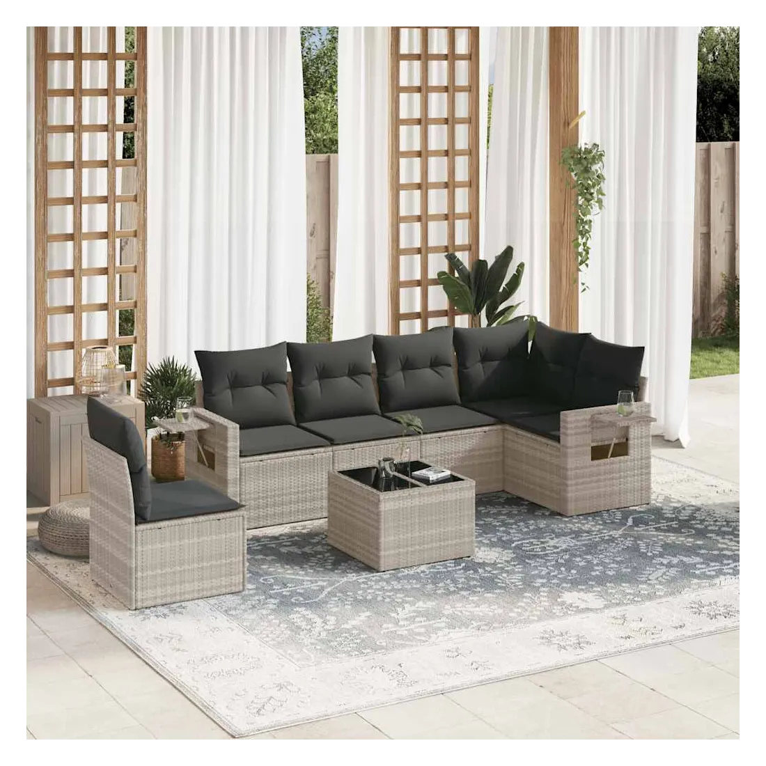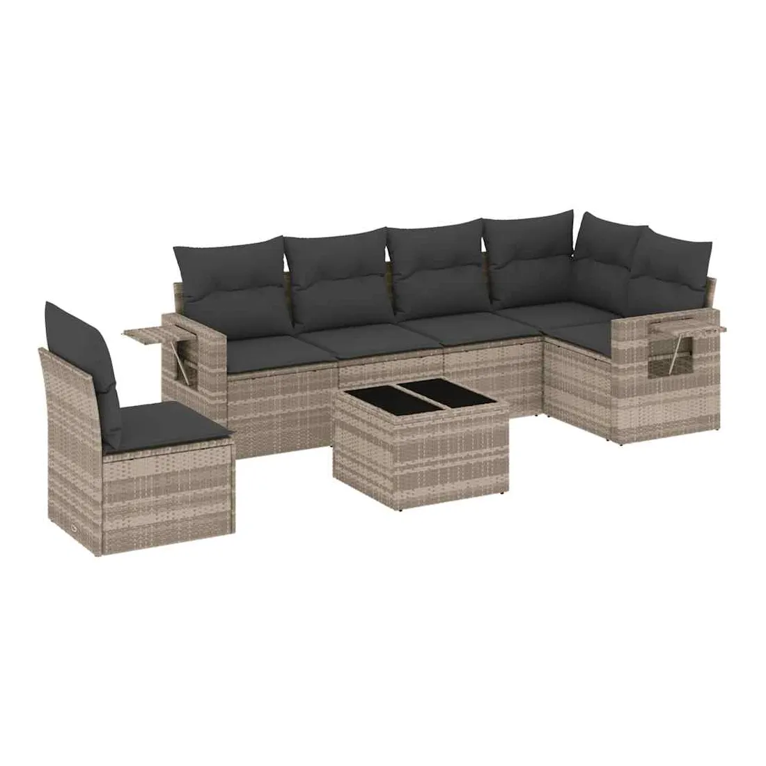 Cet ensemble de canapés de jardin est le complément parfait de votre arrière-cour, terrasse ou patio, offrant un espace confortable et accueillant pour discuter avec la famille et les amis ou simplement se détendre et profiter de l'extérieur. Matériau durable : la résine tressée, également connue sous le nom de poly rotin, est un matériau synthétique solide et nécessitant peu d'entretien qui ressemble au rotin naturel. Il est léger, facile à nettoyer et couramment utilisé pour les meubles d'extérieur en raison de sa durabilité et de ses propriétés de résistance aux intempéries.Dessus en verre : le dessus de la table d'extérieur est fabriqué en verre trempé solide et durable, ce qui le rend facile à nettoyer avec un chiffon humide et ajoute une touche d'élégance à votre espace extérieur. Table d'appoint pratique : ce mobilier d'extérieur comprend des tables d'appoint pliables avec un ressort à gaz sur les accoudoirs, offrant des endroits pratiques pour garder vos essentiels à portée de main. Expérience d'assise confortable : ce mobilier d'extérieur, doté de coussins épais, offre une expérience d'assise confortable.Conception modulaire : cet ensemble de meubles d'extérieur a une conception modulaire, ce qui le rend complètement flexible et facile à déplacer, afin que vous puissiez créer un agencement de meubles d'extérieur personnalisé. Bon à savoir :Pour que vos meubles d'extérieur restent beaux, nous vous recommandons de les protéger avec une housse imperméable.