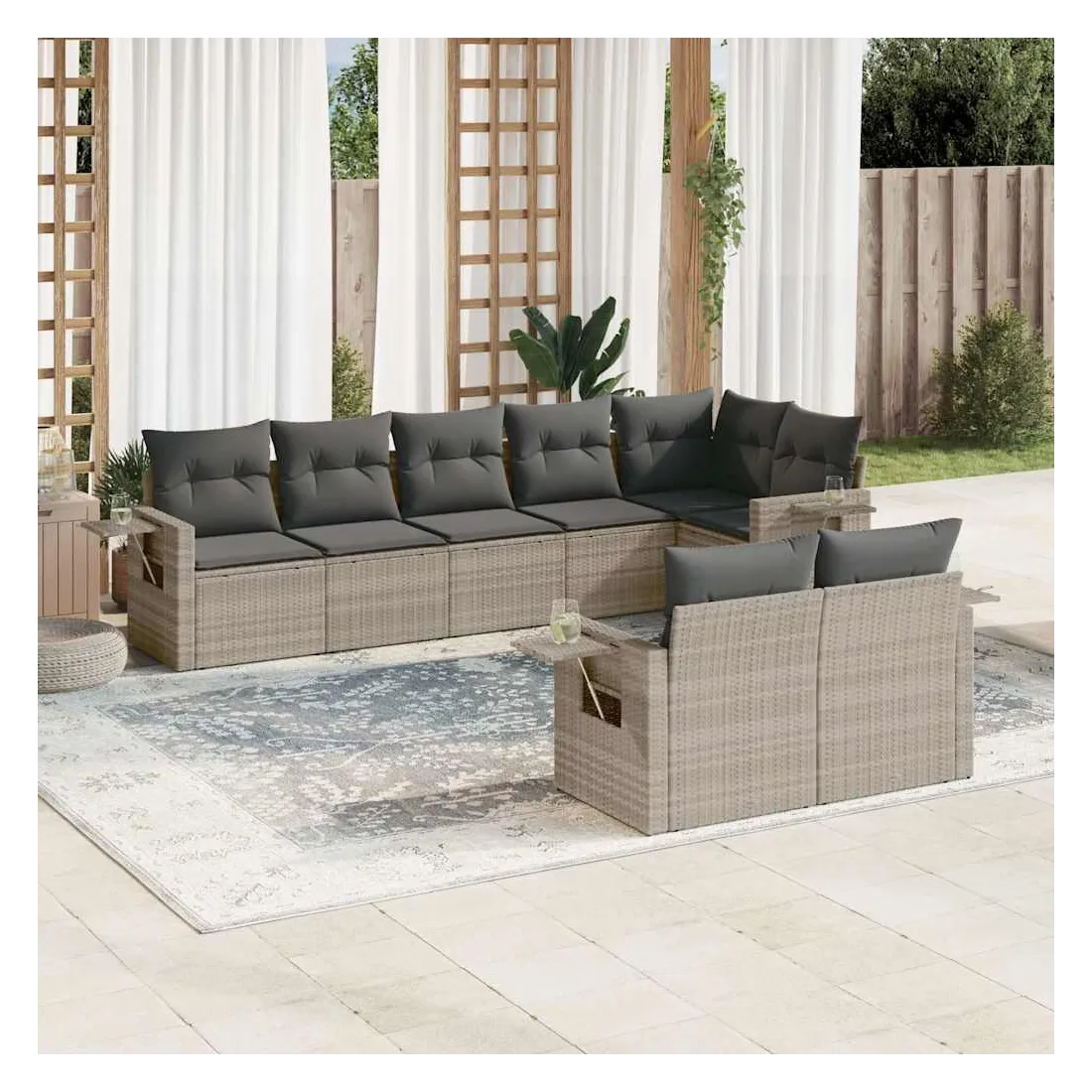 Cet ensemble de canapés de jardin est le complément parfait de votre arrière-cour, terrasse ou patio, offrant un espace confortable et accueillant pour discuter avec la famille et les amis ou simplement se détendre et profiter de l'extérieur. Matériau durable : la résine tressée, également connue sous le nom de poly rotin, est un matériau synthétique solide et nécessitant peu d'entretien qui ressemble au rotin naturel. Il est léger, facile à nettoyer et couramment utilisé pour les meubles d'extérieur en raison de sa durabilité et de ses propriétés de résistance aux intempéries. Table d'appoint pratique : ce mobilier d'extérieur comprend des tables d'appoint pliables avec un ressort à gaz sur les accoudoirs, offrant des endroits pratiques pour garder vos essentiels à portée de main. Expérience d'assise confortable : ce mobilier d'extérieur, doté de coussins épais, offre une expérience d'assise confortable. Housse amovible et lavable : ces coussins de siège sont dotés de housses amovibles pour un lavage et un entretien faciles.Conception modulaire : cet ensemble de meubles d'extérieur a une conception modulaire, ce qui le rend complètement flexible et facile à déplacer, afin que vous puissiez créer un agencement de meubles d'extérieur personnalisé. Bon à savoir :Pour que vos meubles d'extérieur restent beaux, nous vous recommandons de les protéger avec une housse imperméable.