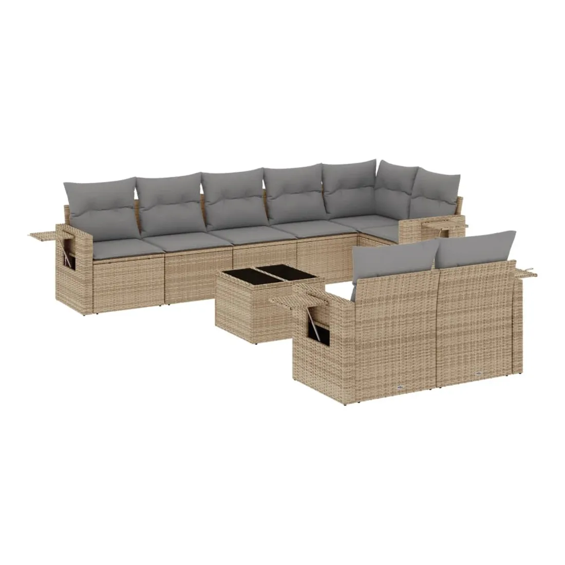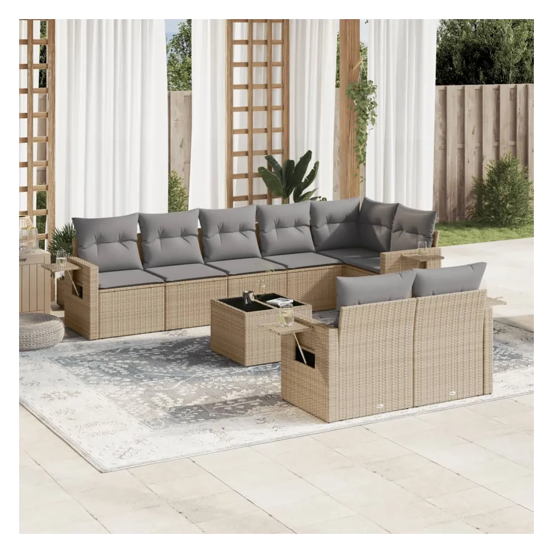 Cet ensemble de canapés de jardin est le complément parfait de votre arrière-cour, terrasse ou patio, offrant un espace confortable et accueillant pour discuter avec la famille et les amis ou simplement se détendre et profiter de l'extérieur. Matériau durable : la résine tressée, également connue sous le nom de poly rotin, est un matériau synthétique solide et nécessitant peu d'entretien qui ressemble au rotin naturel. Il est léger, facile à nettoyer et couramment utilisé pour les meubles d'extérieur en raison de sa durabilité et de ses propriétés de résistance aux intempéries.Dessus en verre : le dessus de la table d'extérieur est fabriqué en verre trempé solide et durable, ce qui le rend facile à nettoyer avec un chiffon humide et ajoute une touche d'élégance à votre espace extérieur. Table d'appoint pratique : ce mobilier d'extérieur comprend des tables d'appoint pliables avec un ressort à gaz sur les accoudoirs, offrant des endroits pratiques pour garder vos essentiels à portée de main. Expérience d'assise confortable : ce mobilier d'extérieur, doté de coussins épais, offre une expérience d'assise confortable.Conception modulaire : cet ensemble de meubles d'extérieur a une conception modulaire, ce qui le rend complètement flexible et facile à déplacer, afin que vous puissiez créer un agencement de meubles d'extérieur personnalisé. Bon à savoir :Pour que vos meubles d'extérieur restent beaux, nous vous recommandons de les protéger avec une housse imperméable.