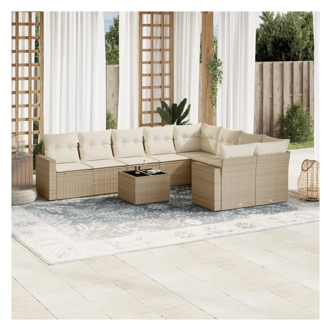 Cet ensemble de canapés de jardin est le complément parfait de votre arrière-cour, terrasse ou patio, offrant un espace confortable et accueillant pour discuter avec la famille et les amis ou simplement se détendre et profiter de l'extérieur. Matériau durable : la résine tressée, également connue sous le nom de poly rotin, est un matériau synthétique solide et nécessitant peu d'entretien qui ressemble au rotin naturel. Il est léger, facile à nettoyer et couramment utilisé pour les meubles d'extérieur en raison de sa durabilité et de ses propriétés de résistance aux intempéries.Expérience d'assise confortable : ce mobilier d'extérieur, doté de coussins épais, offre une expérience d'assise confortable.Housse amovible et lavable : ces coussins de siège sont dotés de housses amovibles pour un lavage et un entretien faciles.Dessus en verre : le dessus de la table d'extérieur est fabriqué en verre trempé solide et durable, ce qui le rend facile à nettoyer avec un chiffon humide et ajoute une touche d'élégance à votre espace extérieur.Conception modulaire : cet ensemble de meubles d'extérieur a une conception modulaire, ce qui le rend complètement flexible et facile à déplacer, afin que vous puissiez créer un agencement de meubles d'extérieur personnalisé. Bon à savoir :Pour que vos meubles d'extérieur restent beaux, nous vous recommandons de les protéger avec une housse imperméable.