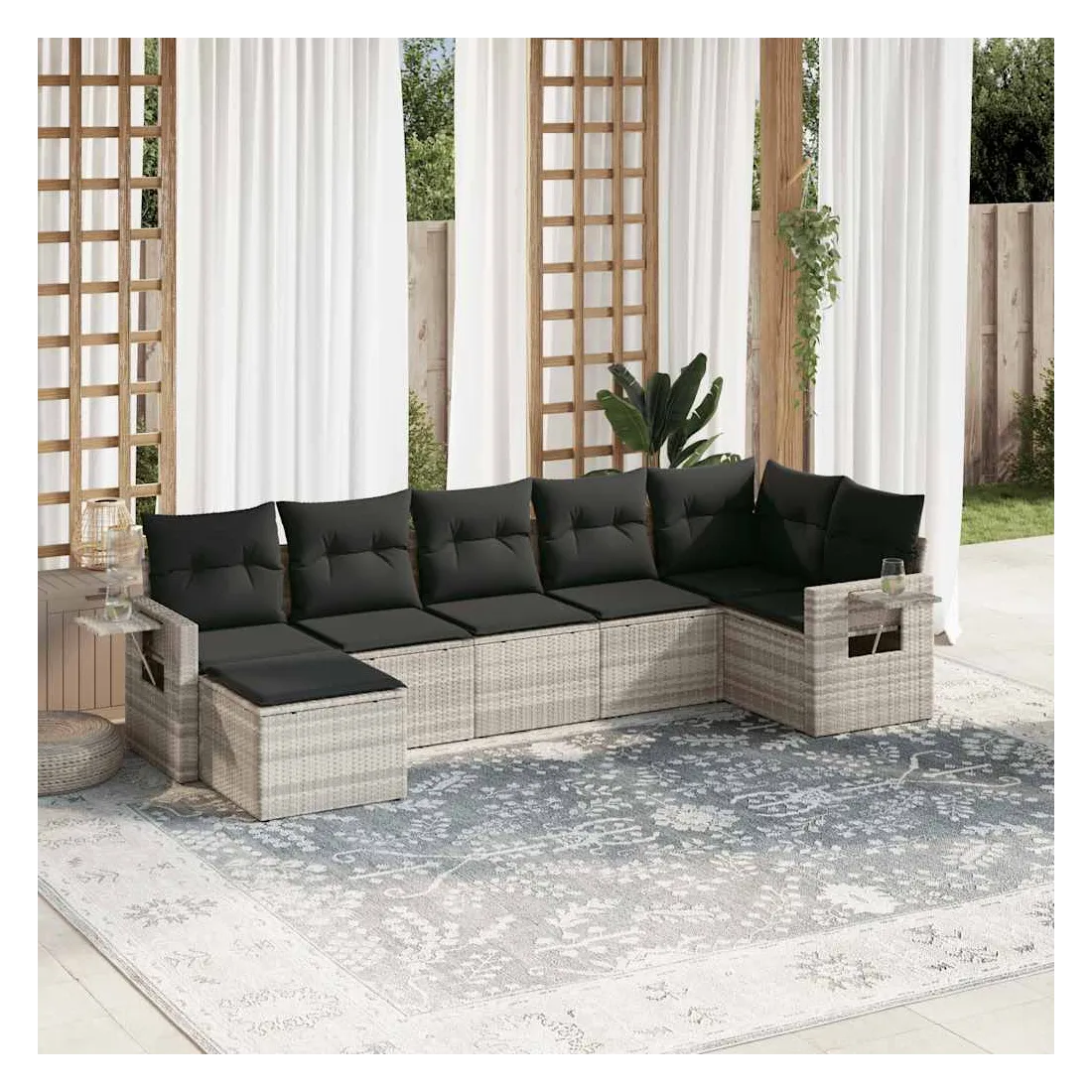 Cet ensemble de canapés de jardin est le complément parfait de votre arrière-cour, terrasse ou patio, offrant un espace confortable et accueillant pour discuter avec la famille et les amis ou simplement se détendre et profiter de l'extérieur. Matériau durable : la résine tressée, également connue sous le nom de poly rotin, est un matériau synthétique solide et nécessitant peu d'entretien qui ressemble au rotin naturel. Il est léger, facile à nettoyer et couramment utilisé pour les meubles d'extérieur en raison de sa durabilité et de ses propriétés de résistance aux intempéries. Table d'appoint pratique : ce mobilier d'extérieur comprend des tables d'appoint pliables avec un ressort à gaz sur les accoudoirs, offrant des endroits pratiques pour garder vos essentiels à portée de main. Expérience d'assise confortable : ce mobilier d'extérieur, doté de coussins épais, offre une expérience d'assise confortable. Housse amovible et lavable : ces coussins de siège sont dotés de housses amovibles pour un lavage et un entretien faciles.Conception modulaire : cet ensemble de meubles d'extérieur a une conception modulaire, ce qui le rend complètement flexible et facile à déplacer, afin que vous puissiez créer un agencement de meubles d'extérieur personnalisé. Bon à savoir :Pour que vos meubles d'extérieur restent beaux, nous vous recommandons de les protéger avec une housse imperméable.