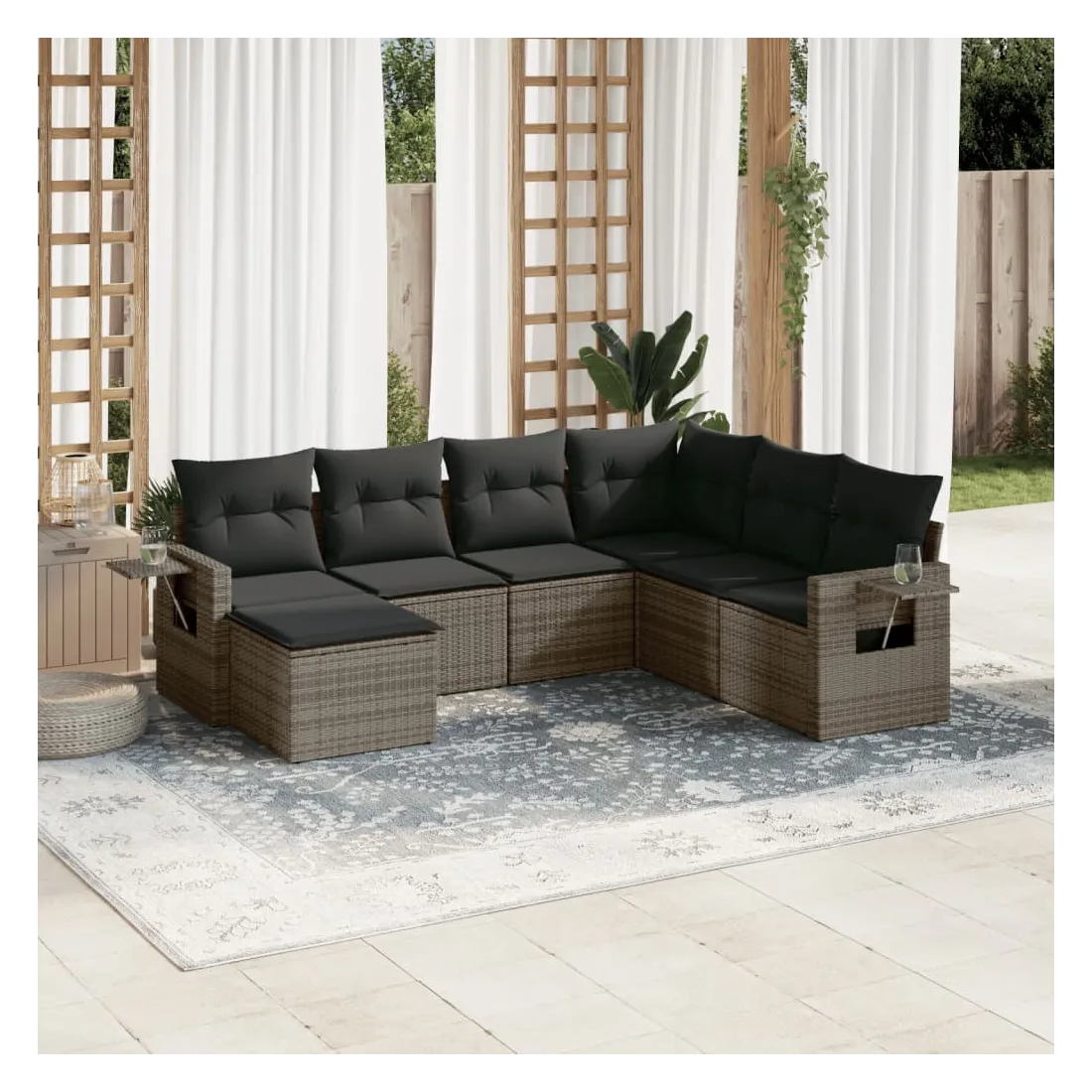 Cet ensemble de canapés de jardin est le complément parfait de votre arrière-cour, terrasse ou patio, offrant un espace confortable et accueillant pour discuter avec la famille et les amis ou simplement se détendre et profiter de l'extérieur. Matériau durable : la résine tressée, également connue sous le nom de poly rotin, est un matériau synthétique solide et nécessitant peu d'entretien qui ressemble au rotin naturel. Il est léger, facile à nettoyer et couramment utilisé pour les meubles d'extérieur en raison de sa durabilité et de ses propriétés de résistance aux intempéries. Table d'appoint pratique : ce mobilier d'extérieur comprend des tables d'appoint pliables avec un ressort à gaz sur les accoudoirs, offrant des endroits pratiques pour garder vos essentiels à portée de main. Expérience d'assise confortable : ce mobilier d'extérieur, doté de coussins épais, offre une expérience d'assise confortable. Housse amovible et lavable : ces coussins de siège sont dotés de housses amovibles pour un lavage et un entretien faciles.Conception modulaire : cet ensemble de meubles d'extérieur a une conception modulaire, ce qui le rend complètement flexible et facile à déplacer, afin que vous puissiez créer un agencement de meubles d'extérieur personnalisé. Bon à savoir :Pour que vos meubles d'extérieur restent beaux, nous vous recommandons de les protéger avec une housse imperméable.
