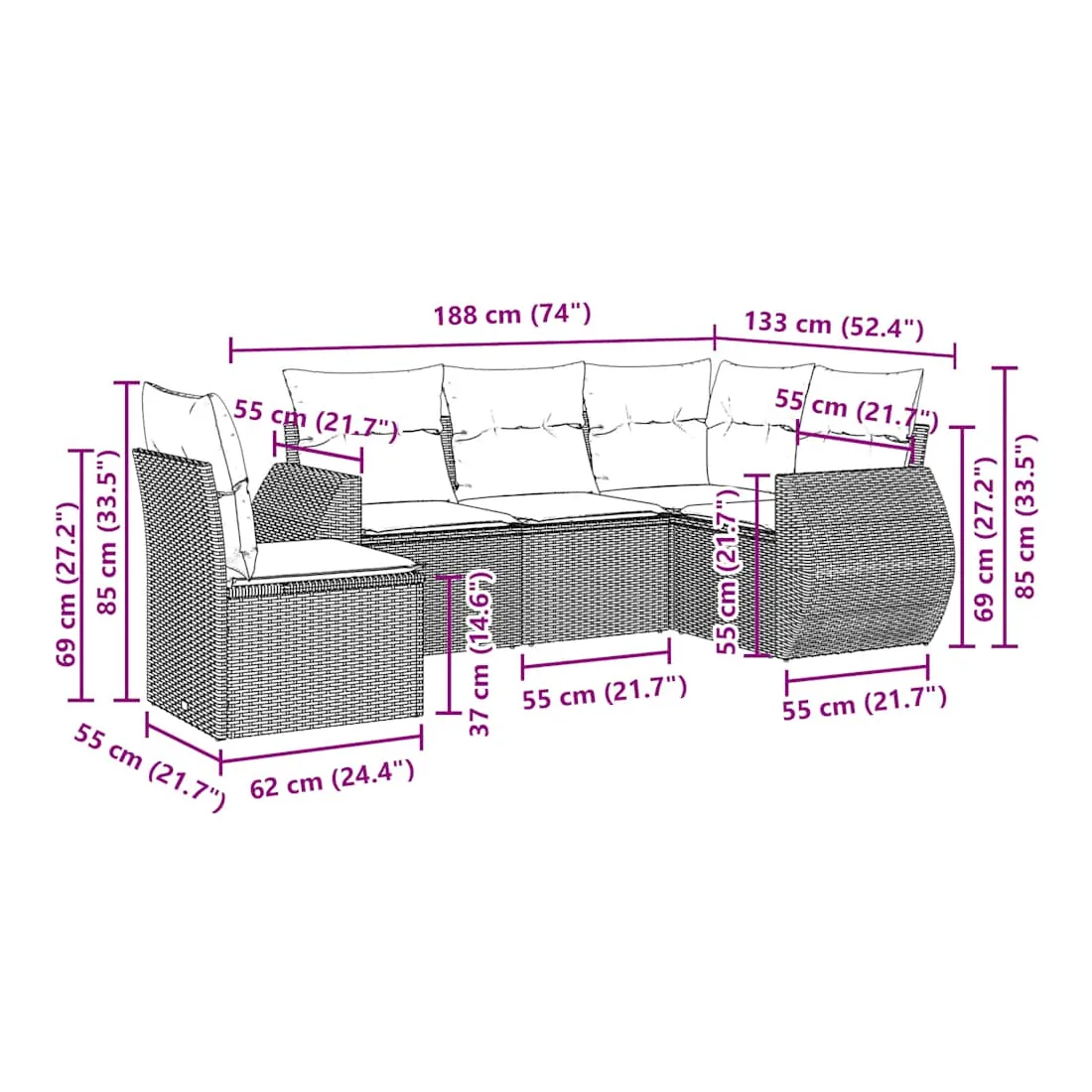Cet ensemble de canapés de jardin est le complément parfait de votre arrière-cour, terrasse ou patio, offrant un espace confortable et accueillant pour discuter avec la famille et les amis ou simplement se détendre et profiter de l'extérieur. Matériau durable : la résine tressée, également connue sous le nom de poly rotin, est un matériau synthétique solide et nécessitant peu d'entretien qui ressemble au rotin naturel. Il est léger, facile à nettoyer et couramment utilisé pour les meubles d'extérieur en raison de sa durabilité et de ses propriétés de résistance aux intempéries. Expérience d'assise confortable : ce mobilier d'extérieur, doté de coussins épais, offre une expérience d'assise confortable.Housse amovible et lavable : ces coussins de siège sont dotés de housses amovibles pour un lavage et un entretien faciles.Conception modulaire : cet ensemble de meubles d'extérieur a une conception modulaire, ce qui le rend complètement flexible et facile à déplacer, afin que vous puissiez créer un agencement de meubles d'extérieur personnalisé.Cadre robuste et stable : le cadre en acier enduit de poudre assure la solidité et la stabilité du meuble de jardin pour une utilisation quotidienne à l'extérieur. Bon à savoir :Pour que vos meubles d'extérieur restent beaux, nous vous recommandons de les protéger avec une housse imperméable.