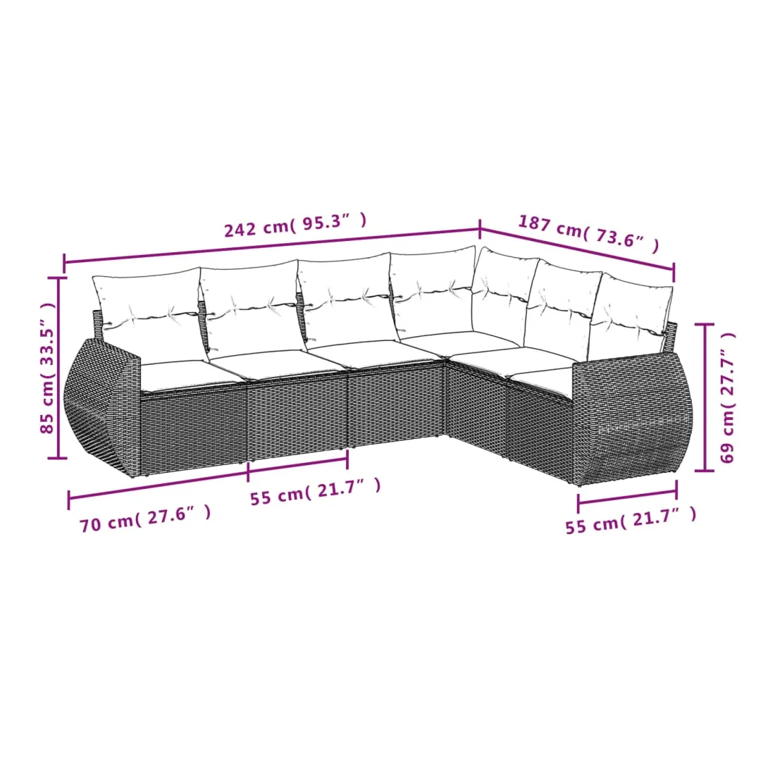 Cet ensemble de canapés de jardin est le complément parfait de votre arrière-cour, terrasse ou patio, offrant un espace confortable et accueillant pour discuter avec la famille et les amis ou simplement se détendre et profiter de l'extérieur. Matériau durable : la résine tressée, également connue sous le nom de poly rotin, est un matériau synthétique solide et nécessitant peu d'entretien qui ressemble au rotin naturel. Il est léger, facile à nettoyer et couramment utilisé pour les meubles d'extérieur en raison de sa durabilité et de ses propriétés de résistance aux intempéries. Expérience d'assise confortable : ce mobilier d'extérieur, doté de coussins épais, offre une expérience d'assise confortable.Housse amovible et lavable : ces coussins de siège sont dotés de housses amovibles pour un lavage et un entretien faciles.Conception modulaire : cet ensemble de meubles d'extérieur a une conception modulaire, ce qui le rend complètement flexible et facile à déplacer, afin que vous puissiez créer un agencement de meubles d'extérieur personnalisé.Cadre robuste et stable : le cadre en acier enduit de poudre assure la solidité et la stabilité du meuble de jardin pour une utilisation quotidienne à l'extérieur. Bon à savoir :Pour que vos meubles d'extérieur restent beaux, nous vous recommandons de les protéger avec une housse imperméable.