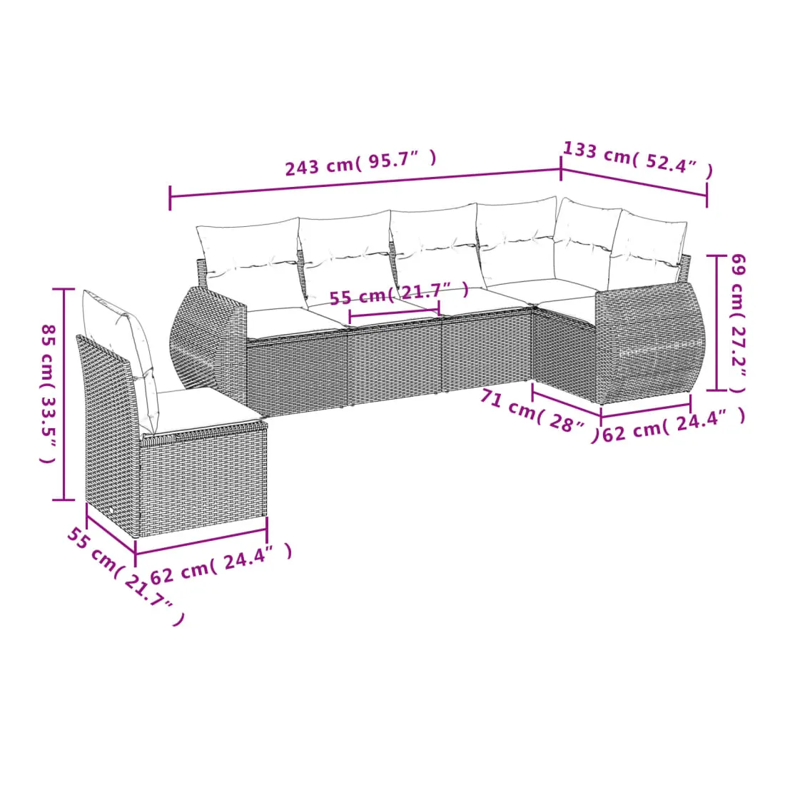Cet ensemble de canapés de jardin est le complément parfait de votre arrière-cour, terrasse ou patio, offrant un espace confortable et accueillant pour discuter avec la famille et les amis ou simplement se détendre et profiter de l'extérieur. Matériau durable : la résine tressée, également connue sous le nom de poly rotin, est un matériau synthétique solide et nécessitant peu d'entretien qui ressemble au rotin naturel. Elle est légère, facile à nettoyer et couramment utilisée pour les meubles d'extérieur en raison de sa durabilité et de ses propriétés de résistance aux intempéries. Expérience d'assise confortable : ce mobilier d'extérieur, doté de coussins épais, offre une expérience d'assise confortable.Housse amovible et lavable : ces coussins de siège sont dotés de housses amovibles pour un lavage et un entretien faciles.Conception modulaire : cet ensemble de meubles d'extérieur a une conception modulaire, ce qui le rend complètement flexible et facile à déplacer, afin que vous puissiez créer un agencement de meubles d'extérieur personnalisé.Cadre robuste et stable : le cadre en acier enduit de poudre assure la solidité et la stabilité du meuble de jardin pour une utilisation quotidienne à l'extérieur. Bon à savoir :Pour que vos meubles d'extérieur restent beaux, nous vous recommandons de les protéger avec une housse imperméable.