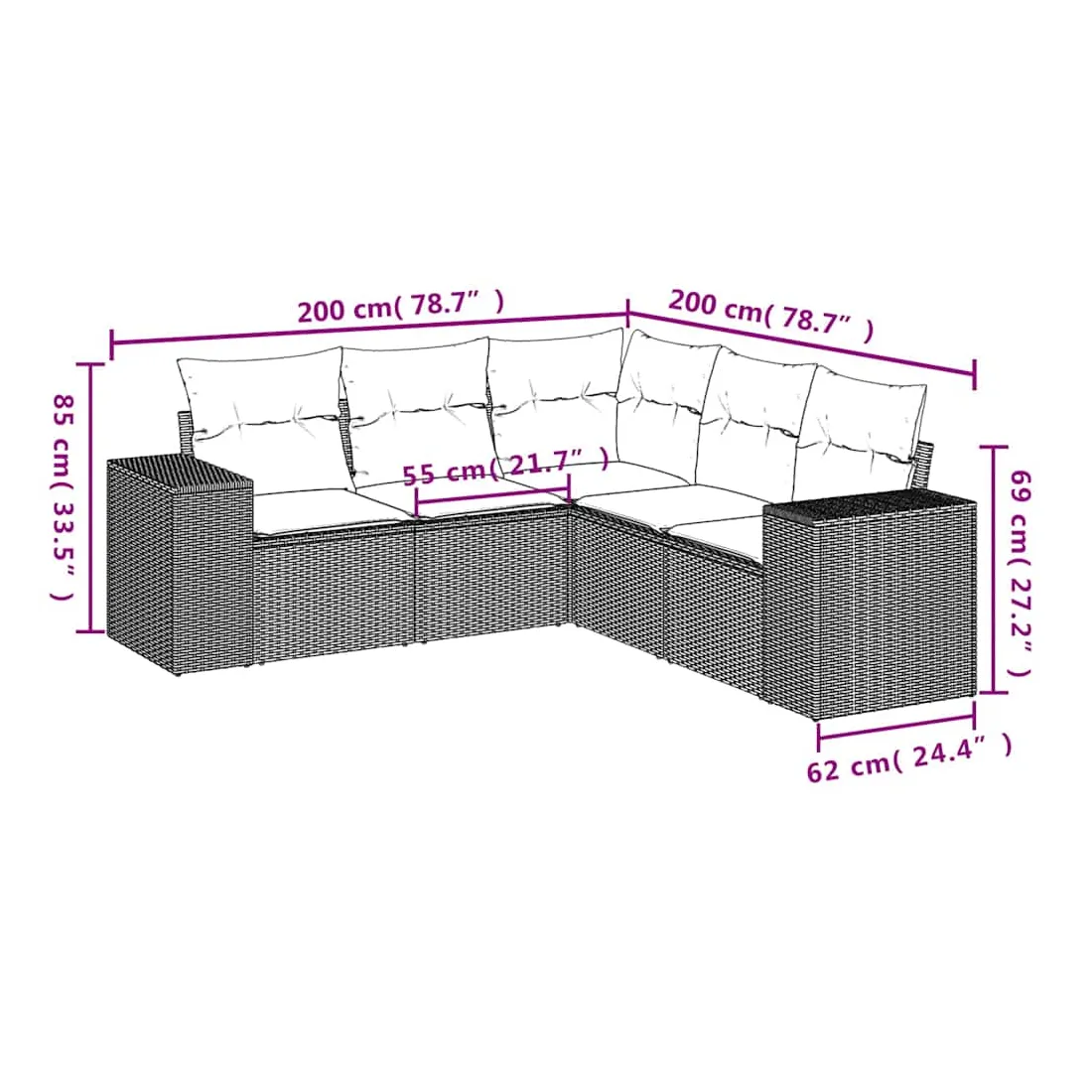 Cet ensemble de canapés de jardin est le complément parfait de votre arrière-cour, terrasse ou patio, offrant un espace confortable et accueillant pour discuter avec la famille et les amis ou simplement se détendre et profiter de l'extérieur. Matériau durable : la résine tressée, également connue sous le nom de poly rotin, est un matériau synthétique solide et nécessitant peu d'entretien qui ressemble au rotin naturel. Il est léger, facile à nettoyer et couramment utilisé pour les meubles d'extérieur en raison de sa durabilité et de ses propriétés de résistance aux intempéries.Expérience d'assise confortable : ce mobilier d'extérieur, doté de coussins épais, offre une expérience d'assise confortable.Housse amovible et lavable : ces coussins de siège sont dotés de housses amovibles pour un lavage et un entretien faciles.Conception modulaire : cet ensemble de meubles d'extérieur a une conception modulaire, ce qui le rend complètement flexible et facile à déplacer, afin que vous puissiez créer un agencement de meubles d'extérieur personnalisé. Bon à savoir :Pour que vos meubles d'extérieur restent beaux, nous vous recommandons de les protéger avec une housse imperméable.