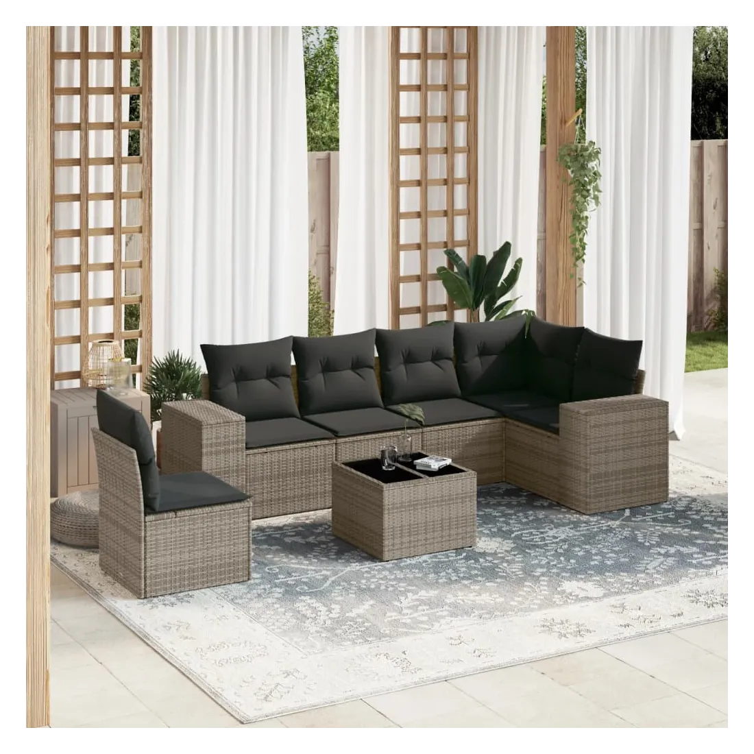 Cet ensemble de canapés de jardin est le complément parfait de votre arrière-cour, terrasse ou patio, offrant un espace confortable et accueillant pour discuter avec la famille et les amis ou simplement se détendre et profiter de l'extérieur. Matériau durable : la résine tressée, également connue sous le nom de poly rotin, est un matériau synthétique solide et nécessitant peu d'entretien qui ressemble au rotin naturel. Il est léger, facile à nettoyer et couramment utilisé pour les meubles d'extérieur en raison de sa durabilité et de ses propriétés de résistance aux intempéries.Expérience d'assise confortable : ce mobilier d'extérieur, doté de coussins épais, offre une expérience d'assise confortable.Dessus en verre : le dessus de la table d'extérieur est fabriqué en verre trempé solide et durable, ce qui le rend facile à nettoyer avec un chiffon humide et ajoute une touche d'élégance à votre espace extérieur.Housse amovible et lavable : ces coussins de siège sont dotés de housses amovibles pour un lavage et un entretien faciles.Conception modulaire : cet ensemble de meubles d'extérieur a une conception modulaire, ce qui le rend complètement flexible et facile à déplacer, afin que vous puissiez créer un agencement de meubles d'extérieur personnalisé. Bon à savoir :Pour que vos meubles d'extérieur restent beaux, nous vous recommandons de les protéger avec une housse imperméable.