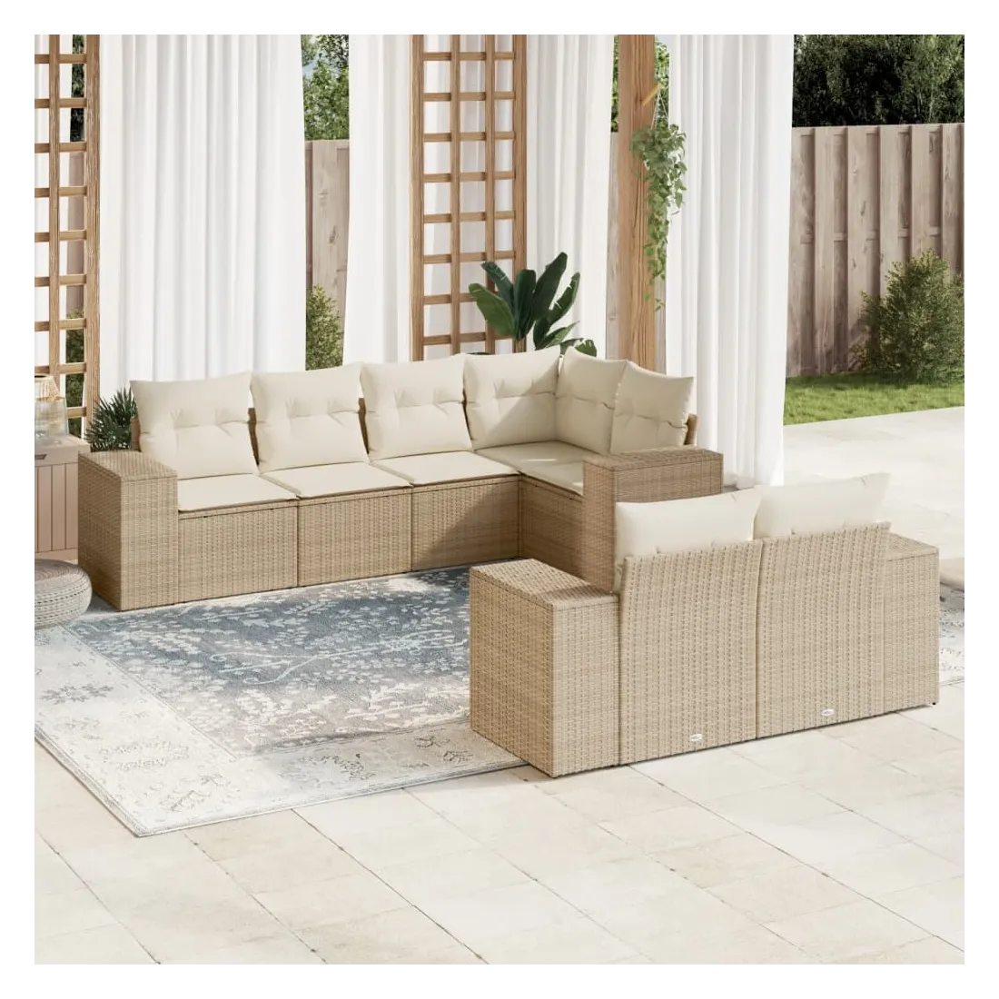 Cet ensemble de canapés de jardin est le complément parfait de votre arrière-cour, terrasse ou patio, offrant un espace confortable et accueillant pour discuter avec la famille et les amis ou simplement se détendre et profiter de l'extérieur. Matériau durable : la résine tressée, également connue sous le nom de poly rotin, est un matériau synthétique solide et nécessitant peu d'entretien qui ressemble au rotin naturel. Il est léger, facile à nettoyer et couramment utilisé pour les meubles d'extérieur en raison de sa durabilité et de ses propriétés de résistance aux intempéries.Expérience d'assise confortable : ce mobilier d'extérieur, doté de coussins épais, offre une expérience d'assise confortable.Housse amovible et lavable : ces coussins de siège sont dotés de housses amovibles pour un lavage et un entretien faciles.Conception modulaire : cet ensemble de meubles d'extérieur a une conception modulaire, ce qui le rend complètement flexible et facile à déplacer, afin que vous puissiez créer un agencement de meubles d'extérieur personnalisé. Bon à savoir :Pour que vos meubles d'extérieur restent beaux, nous vous recommandons de les protéger avec une housse imperméable.
