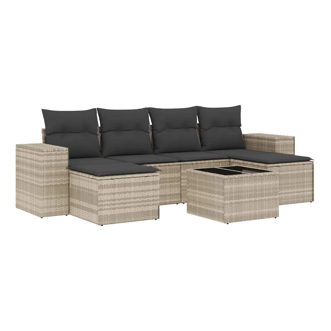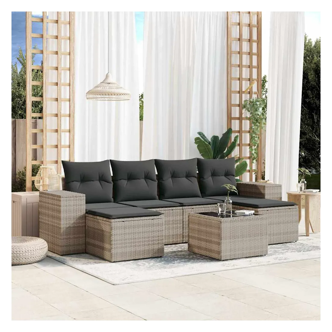 Cet ensemble de canapés de jardin est le complément parfait de votre arrière-cour, terrasse ou patio, offrant un espace confortable et accueillant pour discuter avec la famille et les amis ou simplement se détendre et profiter de l'extérieur. Matériau durable : la résine tressée, également connue sous le nom de poly rotin, est un matériau synthétique solide et nécessitant peu d'entretien qui ressemble au rotin naturel. Il est léger, facile à nettoyer et couramment utilisé pour les meubles d'extérieur en raison de sa durabilité et de ses propriétés de résistance aux intempéries.Expérience d'assise confortable : ce mobilier d'extérieur, doté de coussins épais, offre une expérience d'assise confortable.Dessus en verre : le dessus de la table d'extérieur est fabriqué en verre trempé solide et durable, ce qui le rend facile à nettoyer avec un chiffon humide et ajoute une touche d'élégance à votre espace extérieur.Housse amovible et lavable : ces coussins de siège sont dotés de housses amovibles pour un lavage et un entretien faciles.Conception modulaire : cet ensemble de meubles d'extérieur a une conception modulaire, ce qui le rend complètement flexible et facile à déplacer, afin que vous puissiez créer un agencement de meubles d'extérieur personnalisé. Bon à savoir :Pour que vos meubles d'extérieur restent beaux, nous vous recommandons de les protéger avec une housse imperméable.