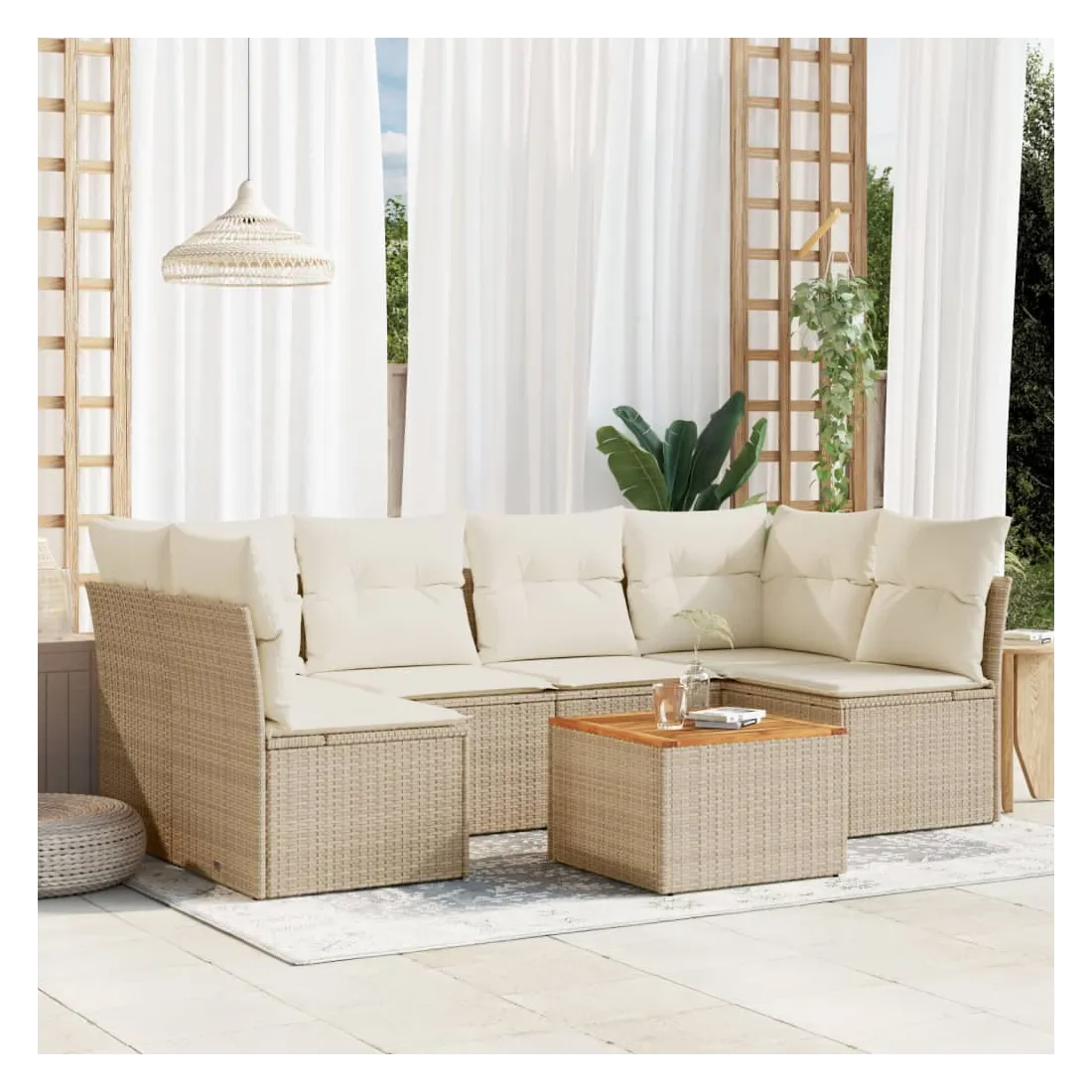Cet ensemble de canapés de jardin est le complément parfait de votre arrière-cour, terrasse ou patio, offrant un espace confortable et accueillant pour discuter avec la famille et les amis ou simplement se détendre et profiter de l'extérieur. Matériau durable : la résine tressée, également connue sous le nom de poly rotin, est un matériau synthétique solide et nécessitant peu d'entretien qui ressemble au rotin naturel. Il est léger, facile à nettoyer et couramment utilisé pour les meubles d'extérieur en raison de sa durabilité et de ses propriétés de résistance aux intempéries.Expérience d'assise confortable : ce mobilier d'extérieur, doté de coussins épais, offre une expérience d'assise confortable.Dessus stable et facile à nettoyer : cette table de jardin a un dessus en bois d'acacia robuste, durable et facile à nettoyer avec un chiffon humide.Housse amovible et lavable : ces coussins de siège sont dotés de housses amovibles pour un lavage et un entretien faciles.Conception modulaire : cet ensemble de meubles d'extérieur a une conception modulaire, ce qui le rend complètement flexible et facile à déplacer, afin que vous puissiez créer un agencement de meubles d'extérieur personnalisé. Bon à savoir :Pour que vos meubles d'extérieur restent beaux, nous vous recommandons de les protéger avec une housse imperméable.
