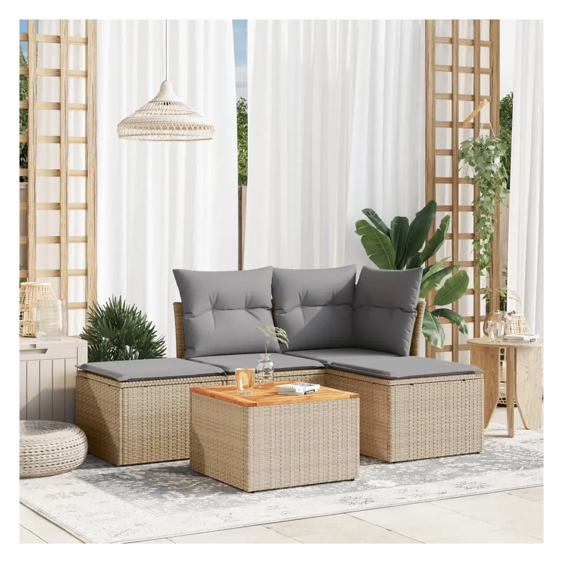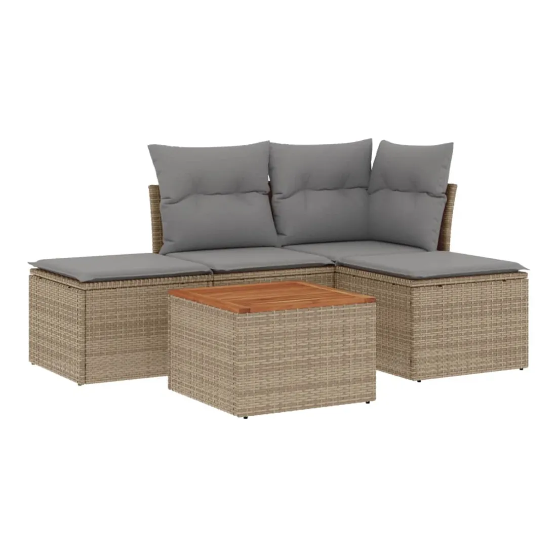 Cet ensemble de canapés de jardin est le complément parfait de votre arrière-cour, terrasse ou patio, offrant un espace confortable et accueillant pour discuter avec la famille et les amis ou simplement se détendre et profiter de l'extérieur. Matériau durable : la résine tressée, également connue sous le nom de poly rotin, est un matériau synthétique solide et nécessitant peu d'entretien qui ressemble au rotin naturel. Il est léger, facile à nettoyer et couramment utilisé pour les meubles d'extérieur en raison de sa durabilité et de ses propriétés de résistance aux intempéries.Expérience d'assise confortable : ce mobilier d'extérieur, doté de coussins épais, offre une expérience d'assise confortable.Dessus stable et facile à nettoyer : cette table de jardin a un dessus en bois d'acacia robuste, durable et facile à nettoyer avec un chiffon humide.Housse amovible et lavable : ces coussins de siège sont dotés de housses amovibles pour un lavage et un entretien faciles.Conception modulaire : cet ensemble de meubles d'extérieur a une conception modulaire, ce qui le rend complètement flexible et facile à déplacer, afin que vous puissiez créer un agencement de meubles d'extérieur personnalisé. Bon à savoir :Pour que vos meubles d'extérieur restent beaux, nous vous recommandons de les protéger avec une housse imperméable.
