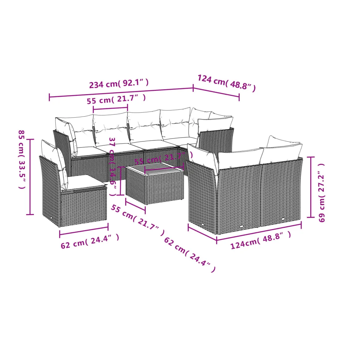 • 8 x coussin d'assise avec housse amovible et lavable