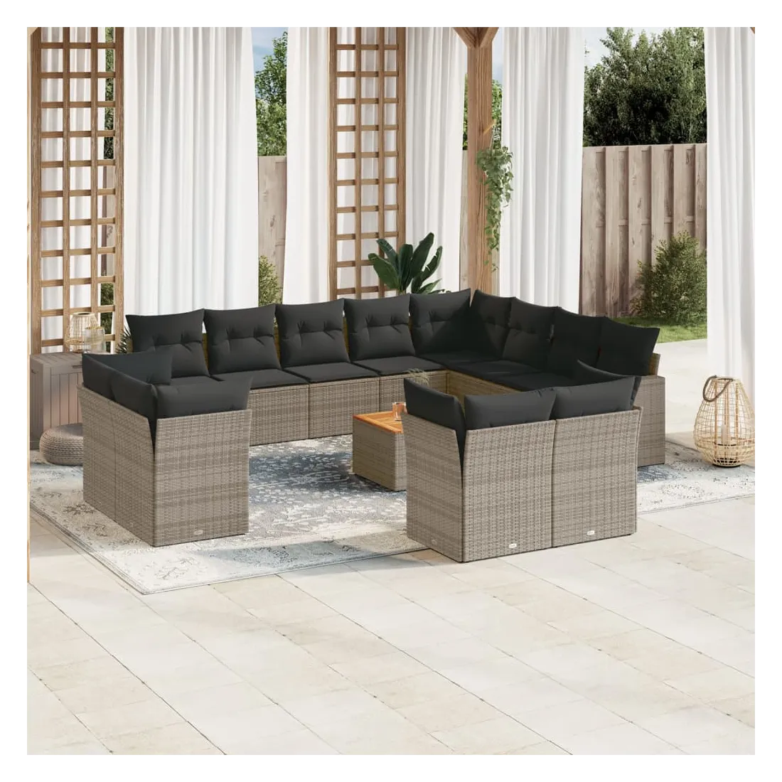 Cet ensemble de canapés de jardin est le complément parfait de votre arrière-cour, terrasse ou patio, offrant un espace confortable et accueillant pour discuter avec la famille et les amis ou simplement se détendre et profiter de l'extérieur. Matériau durable : la résine tressée, également connue sous le nom de poly rotin, est un matériau synthétique solide et nécessitant peu d'entretien qui ressemble au rotin naturel. Il est léger, facile à nettoyer et couramment utilisé pour les meubles d'extérieur en raison de sa durabilité et de ses propriétés de résistance aux intempéries.Expérience d'assise confortable : ce mobilier d'extérieur, doté de coussins épais, offre une expérience d'assise confortable.Dessus stable et facile à nettoyer : cette table de jardin a un dessus en bois d'acacia robuste, durable et facile à nettoyer avec un chiffon humide.Housse amovible et lavable : ces coussins de siège sont dotés de housses amovibles pour un lavage et un entretien faciles.Conception modulaire : cet ensemble de meubles d'extérieur a une conception modulaire, ce qui le rend complètement flexible et facile à déplacer, afin que vous puissiez créer un agencement de meubles d'extérieur personnalisé. Bon à savoir :Pour que vos meubles d'extérieur restent beaux, nous vous recommandons de les protéger avec une housse imperméable.