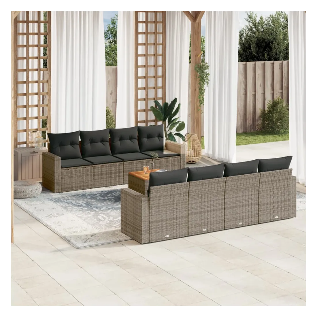 Cet ensemble de canapés de jardin est le complément parfait de votre arrière-cour, terrasse ou patio, offrant un espace confortable et accueillant pour discuter avec la famille et les amis ou simplement se détendre et profiter de l'extérieur. Matériau durable : la résine tressée, également connue sous le nom de poly rotin, est un matériau synthétique solide et nécessitant peu d'entretien qui ressemble au rotin naturel. Il est léger, facile à nettoyer et couramment utilisé pour les meubles d'extérieur en raison de sa durabilité et de ses propriétés de résistance aux intempéries.Expérience d'assise confortable : ce mobilier d'extérieur, doté de coussins épais, offre une expérience d'assise confortable.Dessus stable et facile à nettoyer : cette table de jardin a un dessus en bois d'acacia robuste, durable et facile à nettoyer avec un chiffon humide.Housse amovible et lavable : ces coussins de siège sont dotés de housses amovibles pour un lavage et un entretien faciles.Conception modulaire : cet ensemble de meubles d'extérieur a une conception modulaire, ce qui le rend complètement flexible et facile à déplacer, afin que vous puissiez créer un agencement de meubles d'extérieur personnalisé. Bon à savoir :Pour que vos meubles d'extérieur restent beaux, nous vous recommandons de les protéger avec une housse imperméable.