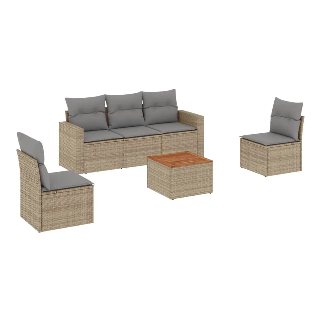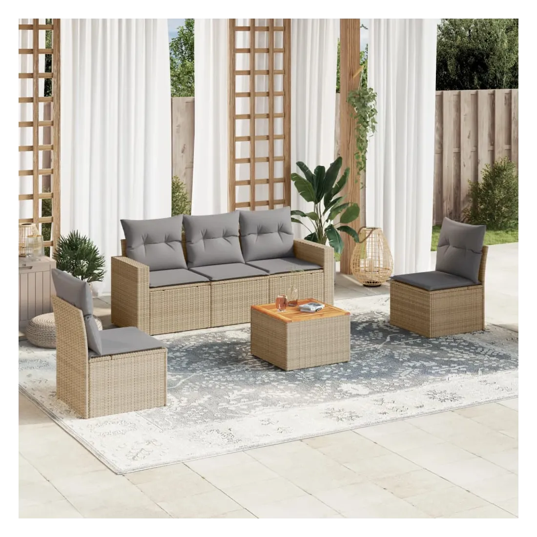 Cet ensemble de canapés de jardin est le complément parfait de votre arrière-cour, terrasse ou patio, offrant un espace confortable et accueillant pour discuter avec la famille et les amis ou simplement se détendre et profiter de l'extérieur. Matériau durable : la résine tressée, également connue sous le nom de poly rotin, est un matériau synthétique solide et nécessitant peu d'entretien qui ressemble au rotin naturel. Il est léger, facile à nettoyer et couramment utilisé pour les meubles d'extérieur en raison de sa durabilité et de ses propriétés de résistance aux intempéries.Expérience d'assise confortable : ce mobilier d'extérieur, doté de coussins épais, offre une expérience d'assise confortable.Dessus stable et facile à nettoyer : cette table de jardin a un dessus en bois d'acacia robuste, durable et facile à nettoyer avec un chiffon humide.Housse amovible et lavable : ces coussins de siège sont dotés de housses amovibles pour un lavage et un entretien faciles.Conception modulaire : cet ensemble de meubles d'extérieur a une conception modulaire, ce qui le rend complètement flexible et facile à déplacer, afin que vous puissiez créer un agencement de meubles d'extérieur personnalisé. Bon à savoir :Pour que vos meubles d'extérieur restent beaux, nous vous recommandons de les protéger avec une housse imperméable.