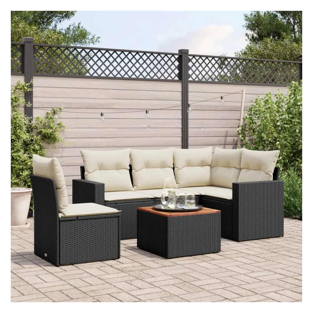 Salon de jardin 6 pcs avec coussins noir résine tressée