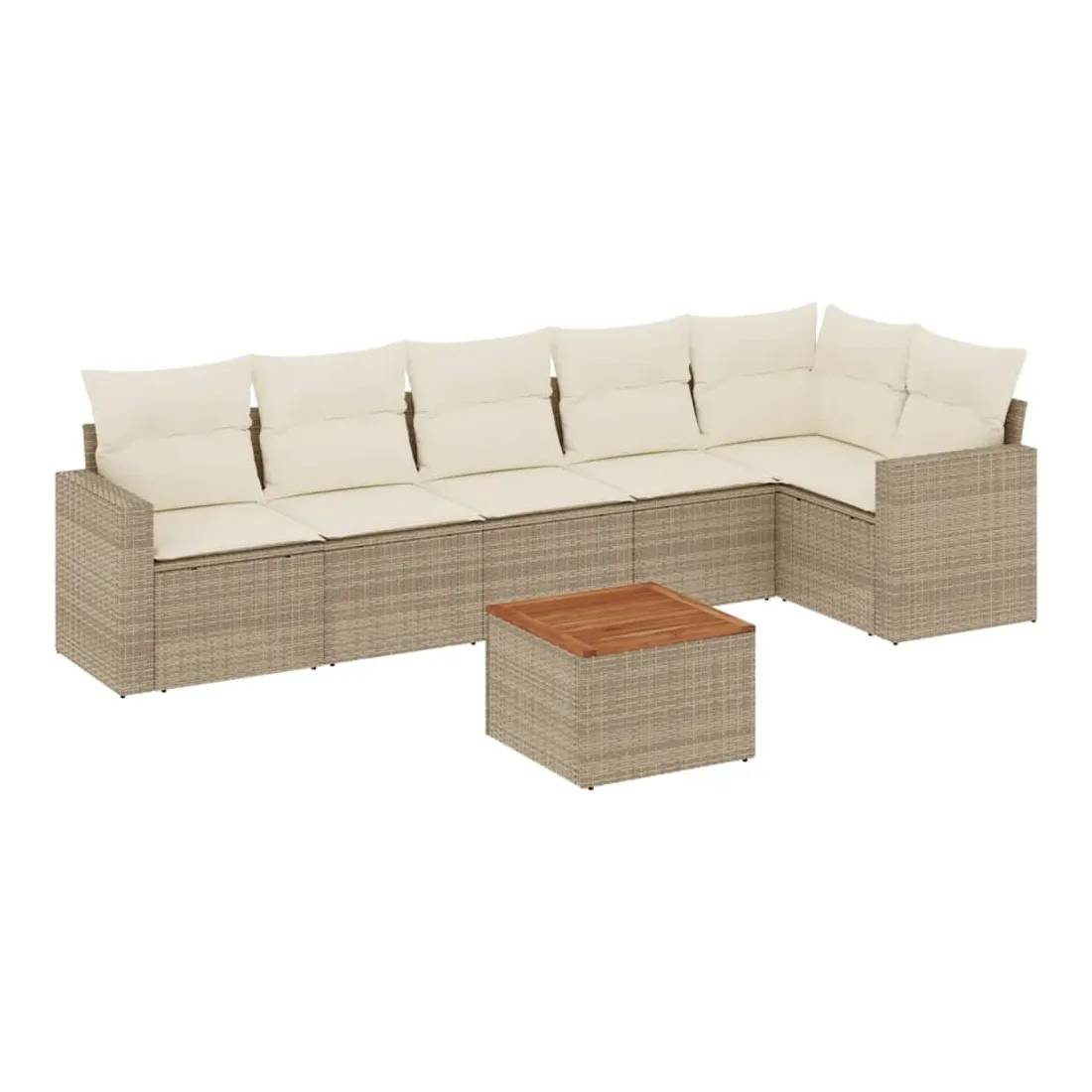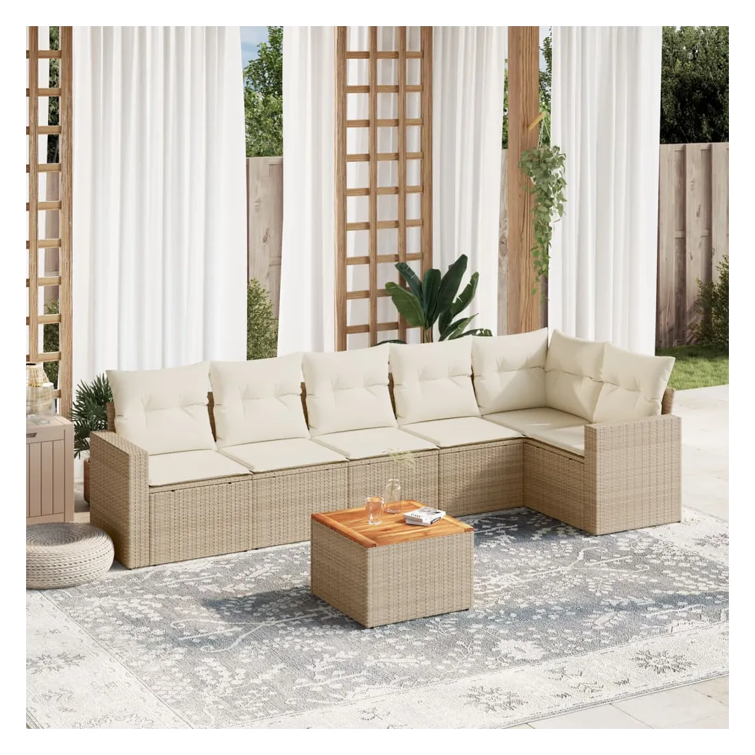 Cet ensemble de canapés de jardin est le complément parfait de votre arrière-cour, terrasse ou patio, offrant un espace confortable et accueillant pour discuter avec la famille et les amis ou simplement se détendre et profiter de l'extérieur. Matériau durable : la résine tressée, également connue sous le nom de poly rotin, est un matériau synthétique solide et nécessitant peu d'entretien qui ressemble au rotin naturel. Il est léger, facile à nettoyer et couramment utilisé pour les meubles d'extérieur en raison de sa durabilité et de ses propriétés de résistance aux intempéries.Expérience d'assise confortable : ce mobilier d'extérieur, doté de coussins épais, offre une expérience d'assise confortable.Dessus stable et facile à nettoyer : cette table de jardin a un dessus en bois d'acacia robuste, durable et facile à nettoyer avec un chiffon humide.Housse amovible et lavable : ces coussins de siège sont dotés de housses amovibles pour un lavage et un entretien faciles.Conception modulaire : cet ensemble de meubles d'extérieur a une conception modulaire, ce qui le rend complètement flexible et facile à déplacer, afin que vous puissiez créer un agencement de meubles d'extérieur personnalisé. Bon à savoir :Pour que vos meubles d'extérieur restent beaux, nous vous recommandons de les protéger avec une housse imperméable.