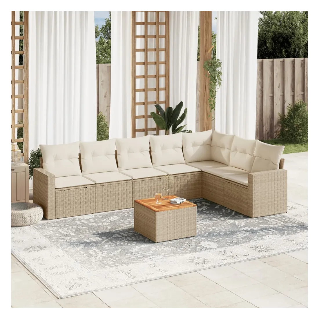Cet ensemble de canapés de jardin est le complément parfait de votre arrière-cour, terrasse ou patio, offrant un espace confortable et accueillant pour discuter avec la famille et les amis ou simplement se détendre et profiter de l'extérieur. Matériau durable : la résine tressée, également connue sous le nom de poly rotin, est un matériau synthétique solide et nécessitant peu d'entretien qui ressemble au rotin naturel. Il est léger, facile à nettoyer et couramment utilisé pour les meubles d'extérieur en raison de sa durabilité et de ses propriétés de résistance aux intempéries.Expérience d'assise confortable : ce mobilier d'extérieur, doté de coussins épais, offre une expérience d'assise confortable.Dessus stable et facile à nettoyer : cette table de jardin a un dessus en bois d'acacia robuste, durable et facile à nettoyer avec un chiffon humide.Housse amovible et lavable : ces coussins de siège sont dotés de housses amovibles pour un lavage et un entretien faciles.Conception modulaire : cet ensemble de meubles d'extérieur a une conception modulaire, ce qui le rend complètement flexible et facile à déplacer, afin que vous puissiez créer un agencement de meubles d'extérieur personnalisé. Bon à savoir :Pour que vos meubles d'extérieur restent beaux, nous vous recommandons de les protéger avec une housse imperméable.
