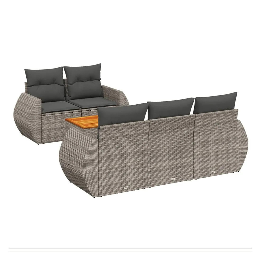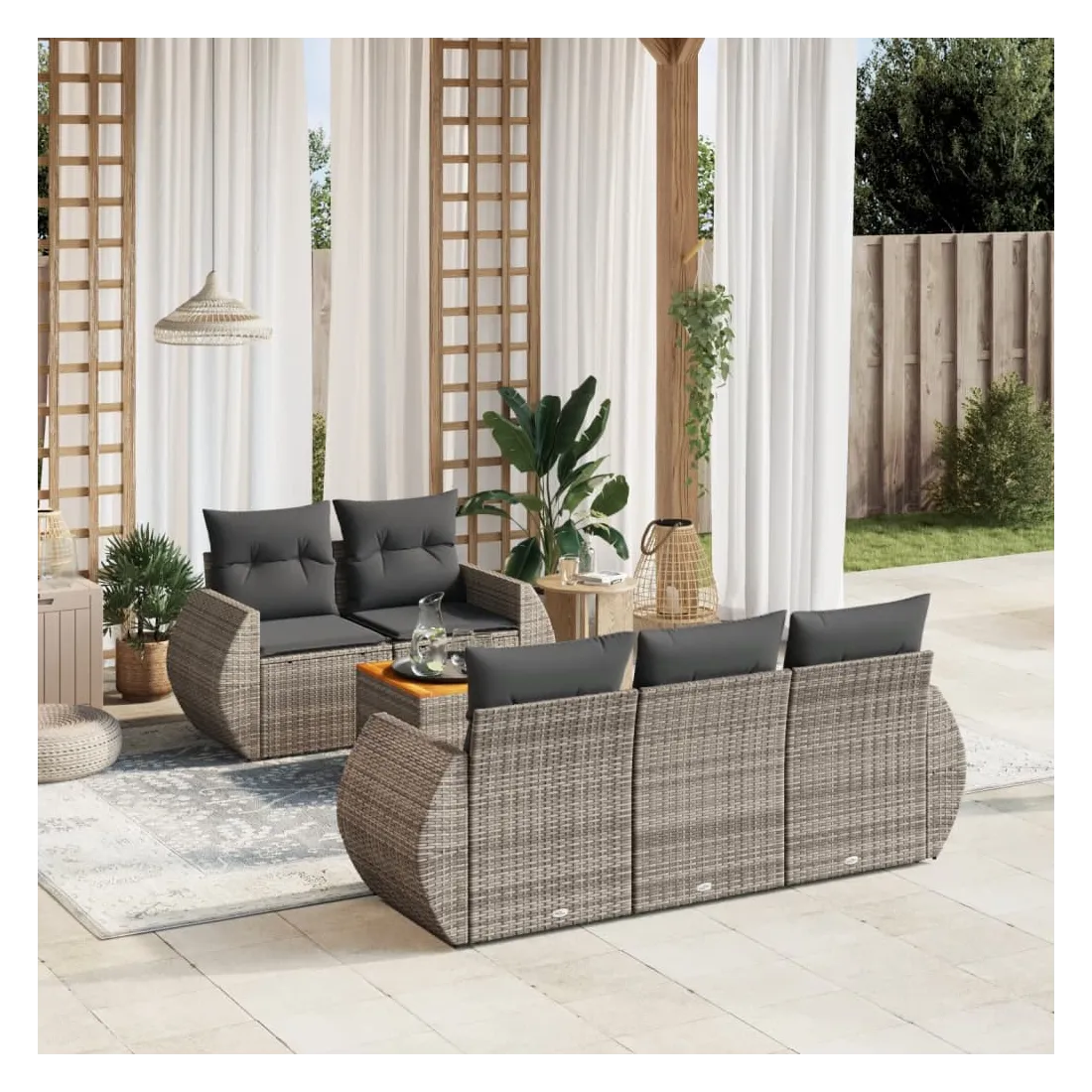 Cet ensemble de canapés de jardin est le complément parfait de votre arrière-cour, terrasse ou patio, offrant un espace confortable et accueillant pour discuter avec la famille et les amis ou simplement se détendre et profiter de l'extérieur. Matériau durable : la résine tressée, également connue sous le nom de poly rotin, est un matériau synthétique solide et nécessitant peu d'entretien qui ressemble au rotin naturel. Il est léger, facile à nettoyer et couramment utilisé pour les meubles d'extérieur en raison de sa durabilité et de ses propriétés de résistance aux intempéries.Dessus stable et facile à nettoyer : cette table de jardin a un dessus en bois d'acacia robuste, durable et facile à nettoyer avec un chiffon humide. Expérience d'assise confortable : ce mobilier d'extérieur, doté de coussins épais, offre une expérience d'assise confortable.Housse amovible et lavable : ces coussins de siège sont dotés de housses amovibles pour un lavage et un entretien faciles.Conception modulaire : cet ensemble de meubles d'extérieur a une conception modulaire, ce qui le rend complètement flexible et facile à déplacer, afin que vous puissiez créer un agencement de meubles d'extérieur personnalisé. Bon à savoir :Pour que vos meubles d'extérieur restent beaux, nous vous recommandons de les protéger avec une housse imperméable.