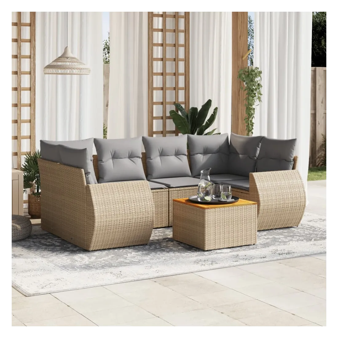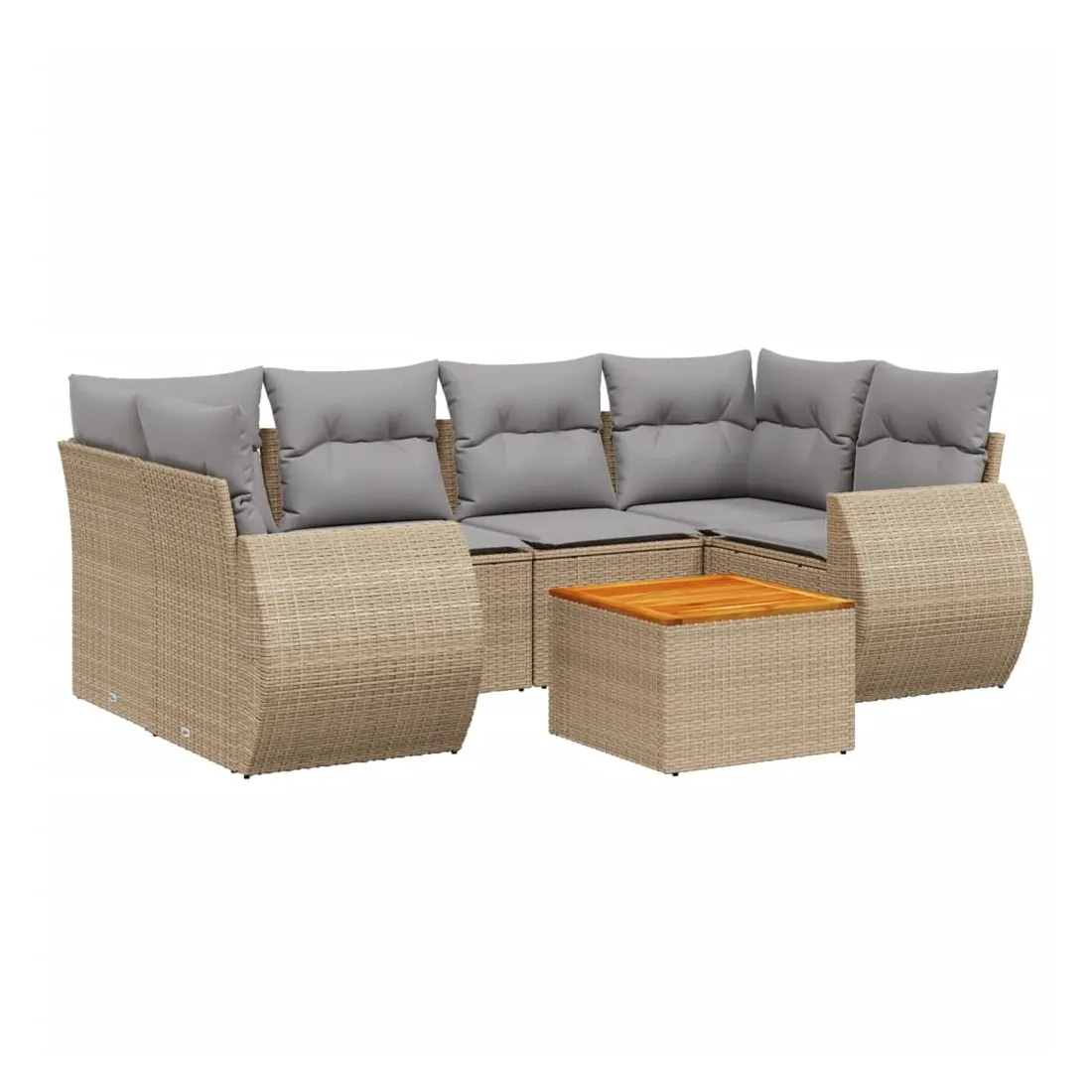 Cet ensemble de canapés de jardin est le complément parfait de votre arrière-cour, terrasse ou patio, offrant un espace confortable et accueillant pour discuter avec la famille et les amis ou simplement se détendre et profiter de l'extérieur. Matériau durable : la résine tressée, également connue sous le nom de poly rotin, est un matériau synthétique solide et nécessitant peu d'entretien qui ressemble au rotin naturel. Il est léger, facile à nettoyer et couramment utilisé pour les meubles d'extérieur en raison de sa durabilité et de ses propriétés de résistance aux intempéries.Dessus stable et facile à nettoyer : cette table de jardin a un dessus en bois d'acacia robuste, durable et facile à nettoyer avec un chiffon humide. Expérience d'assise confortable : ce mobilier d'extérieur, doté de coussins épais, offre une expérience d'assise confortable.Housse amovible et lavable : ces coussins de siège sont dotés de housses amovibles pour un lavage et un entretien faciles.Conception modulaire : cet ensemble de meubles d'extérieur a une conception modulaire, ce qui le rend complètement flexible et facile à déplacer, afin que vous puissiez créer un agencement de meubles d'extérieur personnalisé. Bon à savoir :Pour que vos meubles d'extérieur restent beaux, nous vous recommandons de les protéger avec une housse imperméable.