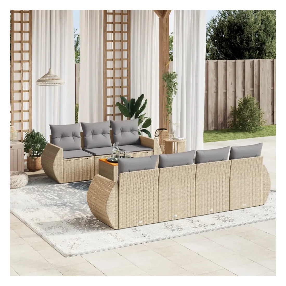 Cet ensemble de canapés de jardin est le complément parfait de votre arrière-cour, terrasse ou patio, offrant un espace confortable et accueillant pour discuter avec la famille et les amis ou simplement se détendre et profiter de l'extérieur. Matériau durable : la résine tressée, également connue sous le nom de poly rotin, est un matériau synthétique solide et nécessitant peu d'entretien qui ressemble au rotin naturel. Il est léger, facile à nettoyer et couramment utilisé pour les meubles d'extérieur en raison de sa durabilité et de ses propriétés de résistance aux intempéries.Dessus stable et facile à nettoyer : cette table de jardin a un dessus en bois d'acacia robuste, durable et facile à nettoyer avec un chiffon humide. Expérience d'assise confortable : ce mobilier d'extérieur, doté de coussins épais, offre une expérience d'assise confortable.Housse amovible et lavable : ces coussins de siège sont dotés de housses amovibles pour un lavage et un entretien faciles.Conception modulaire : cet ensemble de meubles d'extérieur a une conception modulaire, ce qui le rend complètement flexible et facile à déplacer, afin que vous puissiez créer un agencement de meubles d'extérieur personnalisé. Bon à savoir :Pour que vos meubles d'extérieur restent beaux, nous vous recommandons de les protéger avec une housse imperméable.