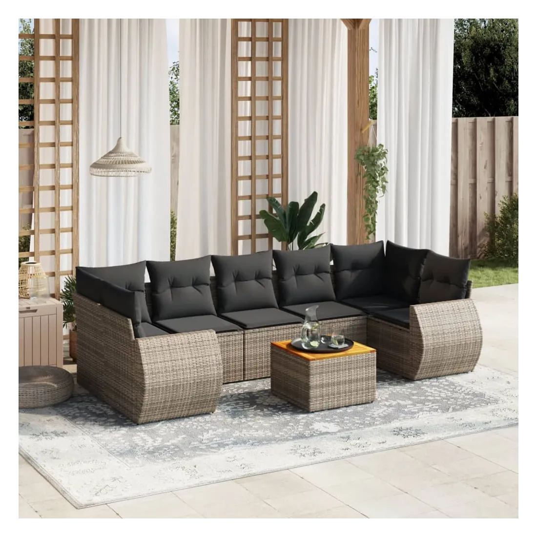 Cet ensemble de canapés de jardin est le complément parfait de votre arrière-cour, terrasse ou patio, offrant un espace confortable et accueillant pour discuter avec la famille et les amis ou simplement se détendre et profiter de l'extérieur. Matériau durable : la résine tressée, également connue sous le nom de poly rotin, est un matériau synthétique solide et nécessitant peu d'entretien qui ressemble au rotin naturel. Il est léger, facile à nettoyer et couramment utilisé pour les meubles d'extérieur en raison de sa durabilité et de ses propriétés de résistance aux intempéries.Dessus stable et facile à nettoyer : cette table de jardin a un dessus en bois d'acacia robuste, durable et facile à nettoyer avec un chiffon humide. Expérience d'assise confortable : ce mobilier d'extérieur, doté de coussins épais, offre une expérience d'assise confortable.Housse amovible et lavable : ces coussins de siège sont dotés de housses amovibles pour un lavage et un entretien faciles.Conception modulaire : cet ensemble de meubles d'extérieur a une conception modulaire, ce qui le rend complètement flexible et facile à déplacer, afin que vous puissiez créer un agencement de meubles d'extérieur personnalisé. Bon à savoir :Pour que vos meubles d'extérieur restent beaux, nous vous recommandons de les protéger avec une housse imperméable.