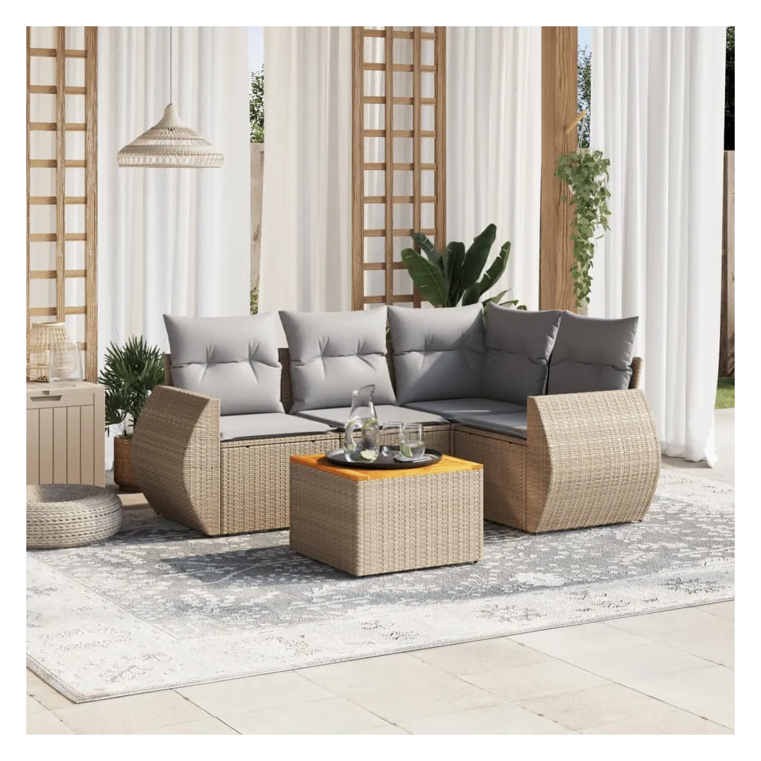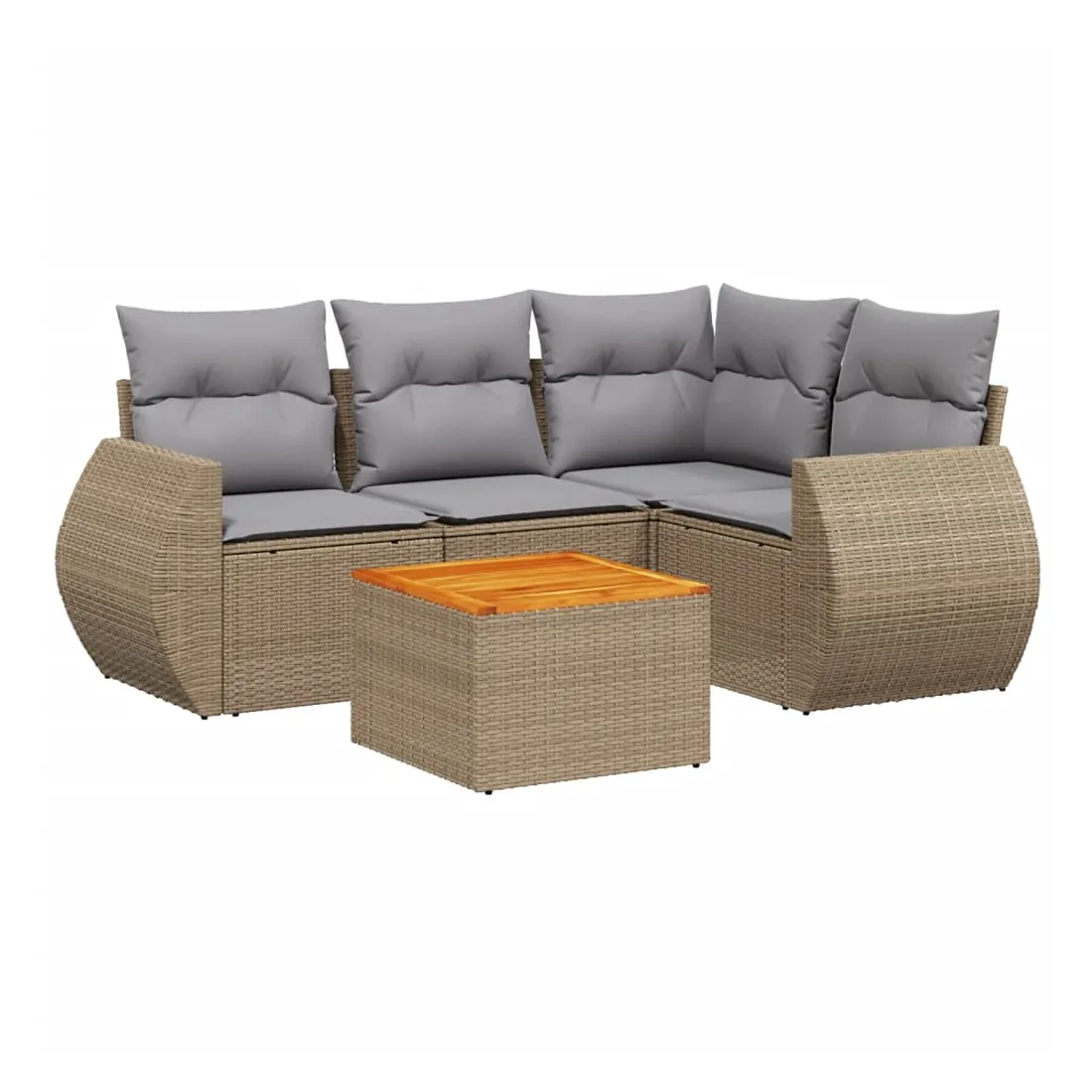 Cet ensemble de canapés de jardin est le complément parfait de votre arrière-cour, terrasse ou patio, offrant un espace confortable et accueillant pour discuter avec la famille et les amis ou simplement se détendre et profiter de l'extérieur. Matériau durable : la résine tressée, également connue sous le nom de poly rotin, est un matériau synthétique solide et nécessitant peu d'entretien qui ressemble au rotin naturel. Il est léger, facile à nettoyer et couramment utilisé pour les meubles d'extérieur en raison de sa durabilité et de ses propriétés de résistance aux intempéries.Dessus stable et facile à nettoyer : cette table de jardin a un dessus en bois d'acacia robuste, durable et facile à nettoyer avec un chiffon humide. Expérience d'assise confortable : ce mobilier d'extérieur, doté de coussins épais, offre une expérience d'assise confortable.Housse amovible et lavable : ces coussins de siège sont dotés de housses amovibles pour un lavage et un entretien faciles.Conception modulaire : cet ensemble de meubles d'extérieur a une conception modulaire, ce qui le rend complètement flexible et facile à déplacer, afin que vous puissiez créer un agencement de meubles d'extérieur personnalisé. Bon à savoir :Pour que vos meubles d'extérieur restent beaux, nous vous recommandons de les protéger avec une housse imperméable.