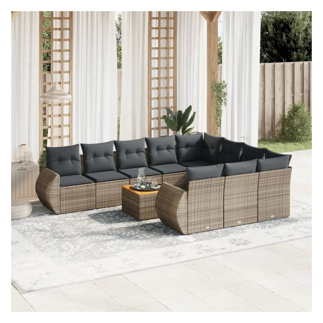 Cet ensemble de canapés de jardin est le complément parfait de votre arrière-cour, terrasse ou patio, offrant un espace confortable et accueillant pour discuter avec la famille et les amis ou simplement se détendre et profiter de l'extérieur. Matériau durable : la résine tressée, également connue sous le nom de poly rotin, est un matériau synthétique solide et nécessitant peu d'entretien qui ressemble au rotin naturel. Il est léger, facile à nettoyer et couramment utilisé pour les meubles d'extérieur en raison de sa durabilité et de ses propriétés de résistance aux intempéries.Dessus stable et facile à nettoyer : cette table de jardin a un dessus en bois d'acacia robuste, durable et facile à nettoyer avec un chiffon humide. Expérience d'assise confortable : ce mobilier d'extérieur, doté de coussins épais, offre une expérience d'assise confortable.Housse amovible et lavable : ces coussins de siège sont dotés de housses amovibles pour un lavage et un entretien faciles.Conception modulaire : cet ensemble de meubles d'extérieur a une conception modulaire, ce qui le rend complètement flexible et facile à déplacer, afin que vous puissiez créer un agencement de meubles d'extérieur personnalisé. Bon à savoir :Pour que vos meubles d'extérieur restent beaux, nous vous recommandons de les protéger avec une housse imperméable.
