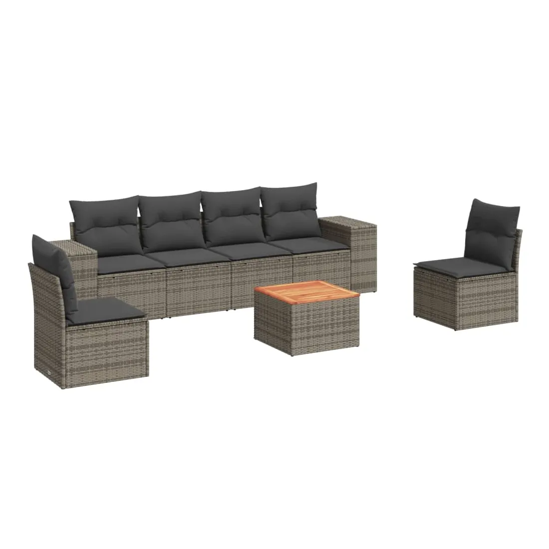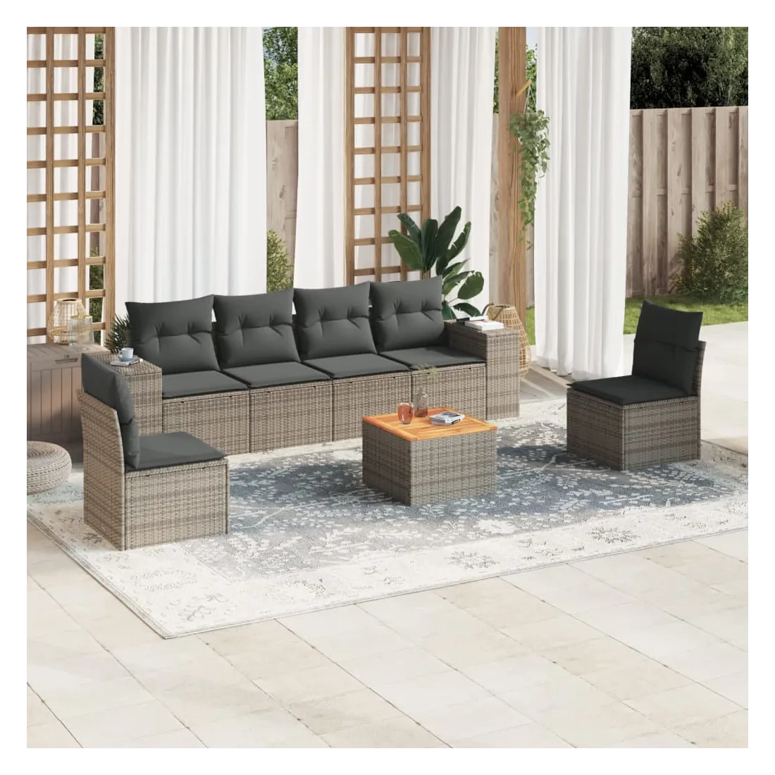 Cet ensemble de canapés de jardin est le complément parfait de votre arrière-cour, terrasse ou patio, offrant un espace confortable et accueillant pour discuter avec la famille et les amis ou simplement se détendre et profiter de l'extérieur. Matériau durable : la résine tressée, également connue sous le nom de poly rotin, est un matériau synthétique solide et nécessitant peu d'entretien qui ressemble au rotin naturel. Il est léger, facile à nettoyer et couramment utilisé pour les meubles d'extérieur en raison de sa durabilité et de ses propriétés de résistance aux intempéries.Dessus stable et facile à nettoyer : cette table de jardin a un dessus en bois d'acacia robuste, durable et facile à nettoyer avec un chiffon humide. Expérience d'assise confortable : ce mobilier d'extérieur, doté de coussins épais, offre une expérience d'assise confortable. Housse amovible et lavable : ces coussins de siège sont dotés de housses amovibles pour un lavage et un entretien faciles.Conception modulaire : cet ensemble de meubles d'extérieur a une conception modulaire, ce qui le rend complètement flexible et facile à déplacer, afin que vous puissiez créer un agencement de meubles d'extérieur personnalisé. Bon à savoir :Pour que vos meubles d'extérieur restent beaux, nous vous recommandons de les protéger avec une housse imperméable.