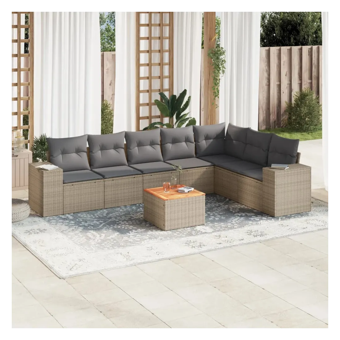 Cet ensemble de canapés de jardin est le complément parfait de votre arrière-cour, terrasse ou patio, offrant un espace confortable et accueillant pour discuter avec la famille et les amis ou simplement se détendre et profiter de l'extérieur. Matériau durable : la résine tressée, également connue sous le nom de poly rotin, est un matériau synthétique solide et nécessitant peu d'entretien qui ressemble au rotin naturel. Il est léger, facile à nettoyer et couramment utilisé pour les meubles d'extérieur en raison de sa durabilité et de ses propriétés de résistance aux intempéries.Dessus stable et facile à nettoyer : cette table de jardin a un dessus en bois d'acacia robuste, durable et facile à nettoyer avec un chiffon humide. Expérience d'assise confortable : ce mobilier d'extérieur, doté de coussins épais, offre une expérience d'assise confortable. Housse amovible et lavable : ces coussins de siège sont dotés de housses amovibles pour un lavage et un entretien faciles.Conception modulaire : cet ensemble de meubles d'extérieur a une conception modulaire, ce qui le rend complètement flexible et facile à déplacer, afin que vous puissiez créer un agencement de meubles d'extérieur personnalisé. Bon à savoir :Pour que vos meubles d'extérieur restent beaux, nous vous recommandons de les protéger avec une housse imperméable.