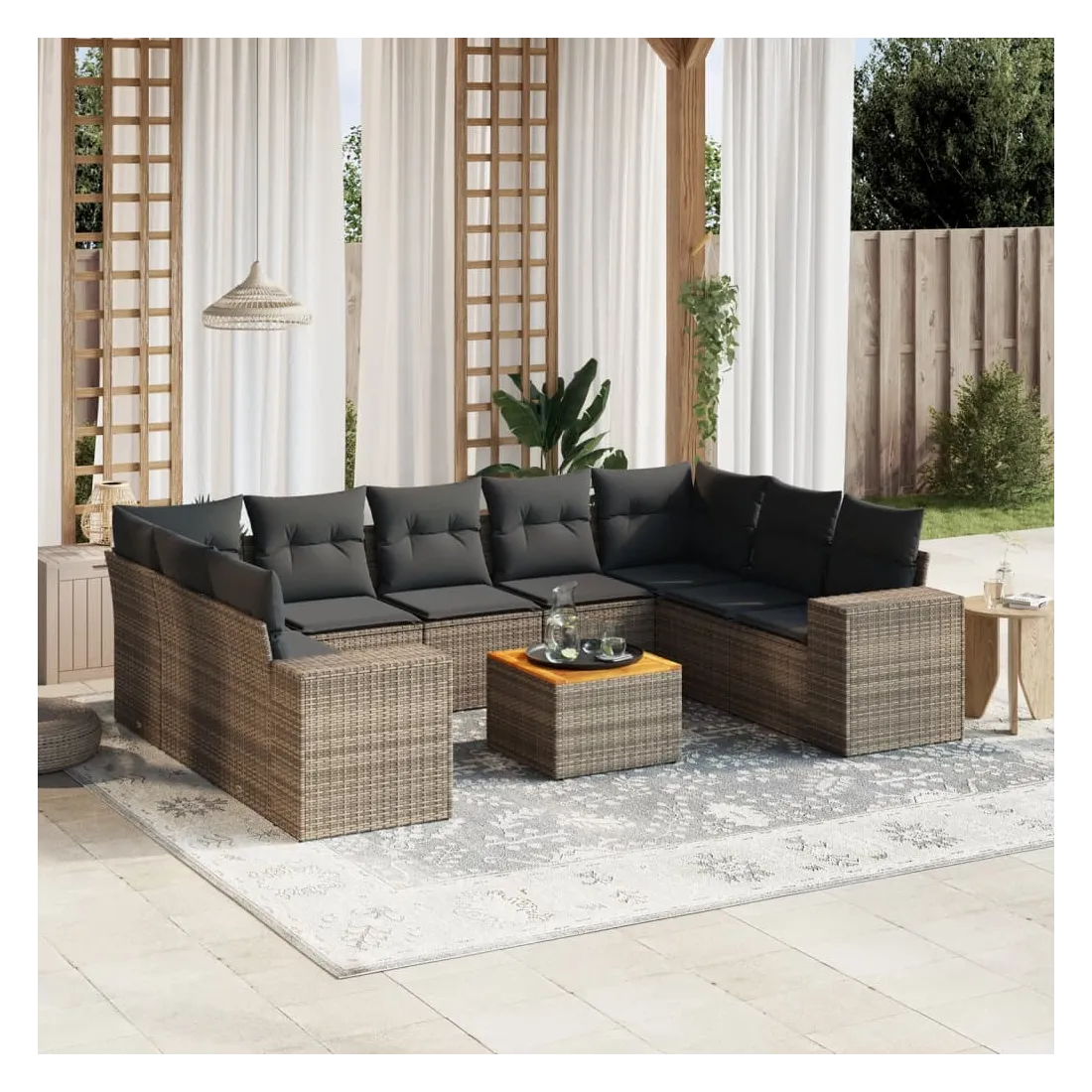 Cet ensemble de canapés de jardin est le complément parfait de votre arrière-cour, terrasse ou patio, offrant un espace confortable et accueillant pour discuter avec la famille et les amis ou simplement se détendre et profiter de l'extérieur. Matériau durable : la résine tressée, également connue sous le nom de poly rotin, est un matériau synthétique solide et nécessitant peu d'entretien qui ressemble au rotin naturel. Il est léger, facile à nettoyer et couramment utilisé pour les meubles d'extérieur en raison de sa durabilité et de ses propriétés de résistance aux intempéries.Dessus stable et facile à nettoyer : cette table de jardin a un dessus en bois d'acacia robuste, durable et facile à nettoyer avec un chiffon humide. Expérience d'assise confortable : ce mobilier d'extérieur, doté de coussins épais, offre une expérience d'assise confortable.Housse amovible et lavable : ces coussins de siège sont dotés de housses amovibles pour un lavage et un entretien faciles.Conception modulaire : cet ensemble de meubles d'extérieur a une conception modulaire, ce qui le rend complètement flexible et facile à déplacer, afin que vous puissiez créer un agencement de meubles d'extérieur personnalisé. Bon à savoir :Pour que vos meubles d'extérieur restent beaux, nous vous recommandons de les protéger avec une housse imperméable.