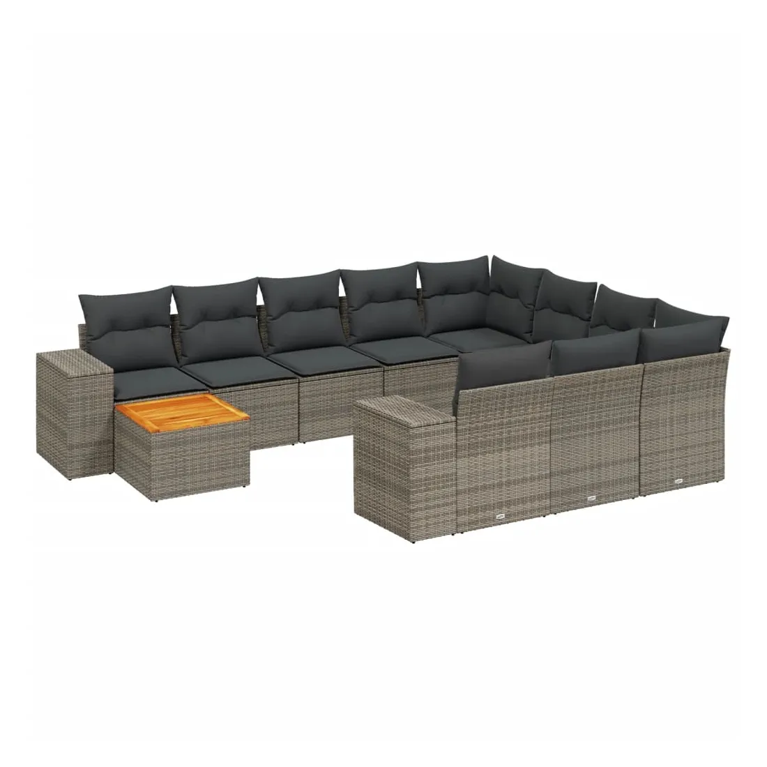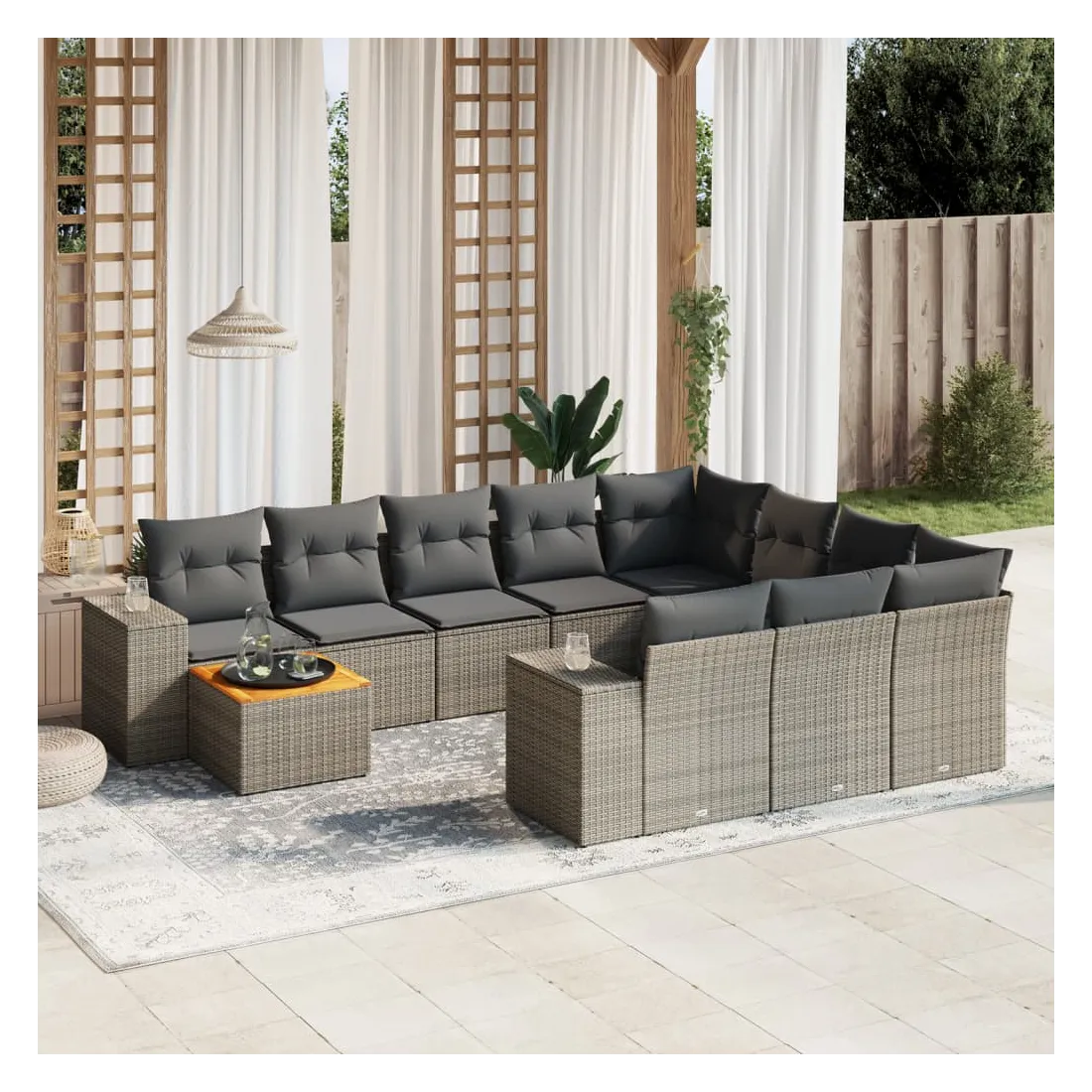 Cet ensemble de canapés de jardin est le complément parfait de votre arrière-cour, terrasse ou patio, offrant un espace confortable et accueillant pour discuter avec la famille et les amis ou simplement se détendre et profiter de l'extérieur. Matériau durable : la résine tressée, également connue sous le nom de poly rotin, est un matériau synthétique solide et nécessitant peu d'entretien qui ressemble au rotin naturel. Il est léger, facile à nettoyer et couramment utilisé pour les meubles d'extérieur en raison de sa durabilité et de ses propriétés de résistance aux intempéries.Dessus stable et facile à nettoyer : cette table de jardin a un dessus en bois d'acacia robuste, durable et facile à nettoyer avec un chiffon humide. Expérience d'assise confortable : ce mobilier d'extérieur, doté de coussins épais, offre une expérience d'assise confortable.Housse amovible et lavable : ces coussins de siège sont dotés de housses amovibles pour un lavage et un entretien faciles.Conception modulaire : cet ensemble de meubles d'extérieur a une conception modulaire, ce qui le rend complètement flexible et facile à déplacer, afin que vous puissiez créer un agencement de meubles d'extérieur personnalisé. Bon à savoir :Pour que vos meubles d'extérieur restent beaux, nous vous recommandons de les protéger avec une housse imperméable.