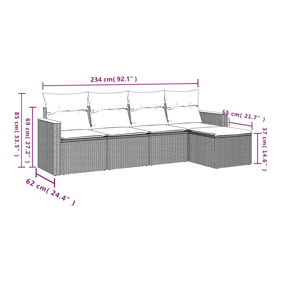 Cet ensemble de canapés de jardin est le complément parfait de votre arrière-cour, terrasse ou patio, offrant un espace confortable et accueillant pour discuter avec la famille et les amis ou simplement se détendre et profiter de l'extérieur. Matériau durable : la résine tressée, également connue sous le nom de poly rotin, est un matériau synthétique solide et nécessitant peu d'entretien qui ressemble au rotin naturel. Il est léger, facile à nettoyer et couramment utilisé pour les meubles d'extérieur en raison de sa durabilité et de ses propriétés de résistance aux intempéries.Housse amovible et lavable : ces coussins de siège sont dotés de housses amovibles pour un lavage et un entretien faciles.Cadre robuste et stable : le cadre en acier enduit de poudre assure la solidité et la stabilité du meuble de jardin pour une utilisation quotidienne à l'extérieur.Conception modulaire : cet ensemble de meubles d'extérieur a une conception modulaire, ce qui le rend complètement flexible et facile à déplacer, afin que vous puissiez créer un agencement de meubles d'extérieur personnalisé. Bon à savoir :Pour que vos meubles d'extérieur restent beaux, nous vous recommandons de les protéger avec une housse imperméable.
