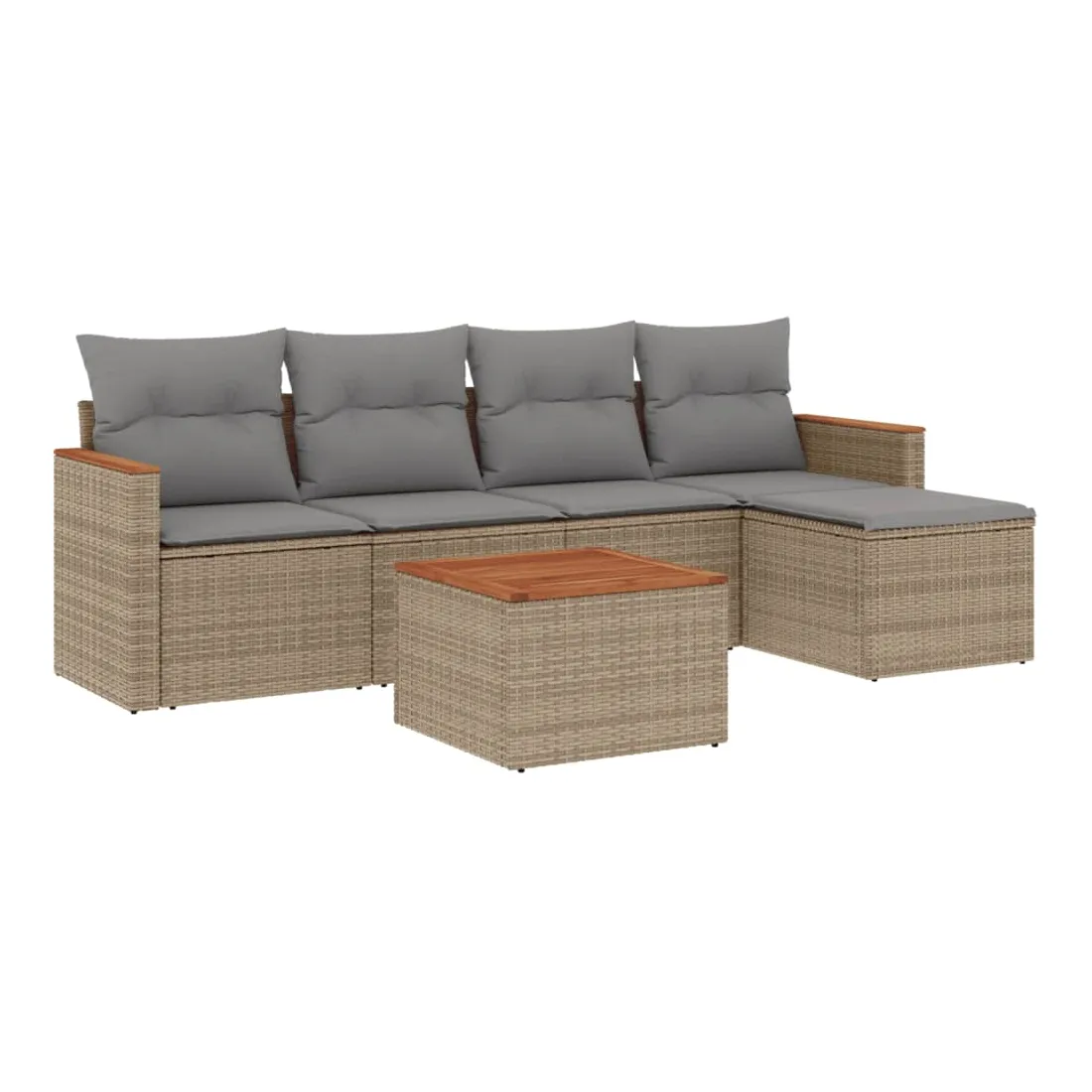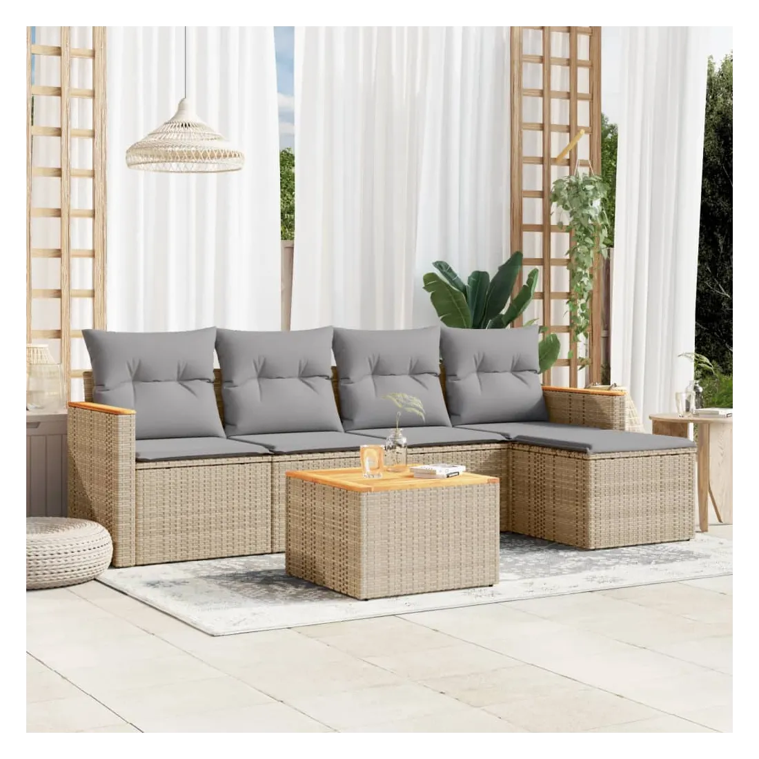 Cet ensemble de canapés de jardin est le complément parfait de votre arrière-cour, terrasse ou patio, offrant un espace confortable et accueillant pour discuter avec la famille et les amis ou simplement se détendre et profiter de l'extérieur. Matériau durable : la résine tressée, également connue sous le nom de poly rotin, est un matériau synthétique solide et nécessitant peu d'entretien qui ressemble au rotin naturel. Il est léger, facile à nettoyer et couramment utilisé pour les meubles d'extérieur en raison de sa durabilité et de ses propriétés de résistance aux intempéries.Dessus stable et facile à nettoyer : cette table de jardin a un dessus en bois d'acacia robuste, durable et facile à nettoyer avec un chiffon humide.Housse amovible et lavable : ces coussins de siège sont dotés de housses amovibles pour un lavage et un entretien faciles.Cadre robuste et stable : le cadre en acier enduit de poudre assure la solidité et la stabilité du meuble de jardin pour une utilisation quotidienne à l'extérieur.Conception modulaire : cet ensemble de meubles d'extérieur a une conception modulaire, ce qui le rend complètement flexible et facile à déplacer, afin que vous puissiez créer un agencement de meubles d'extérieur personnalisé. Bon à savoir :Pour que vos meubles d'extérieur restent beaux, nous vous recommandons de les protéger avec une housse imperméable.