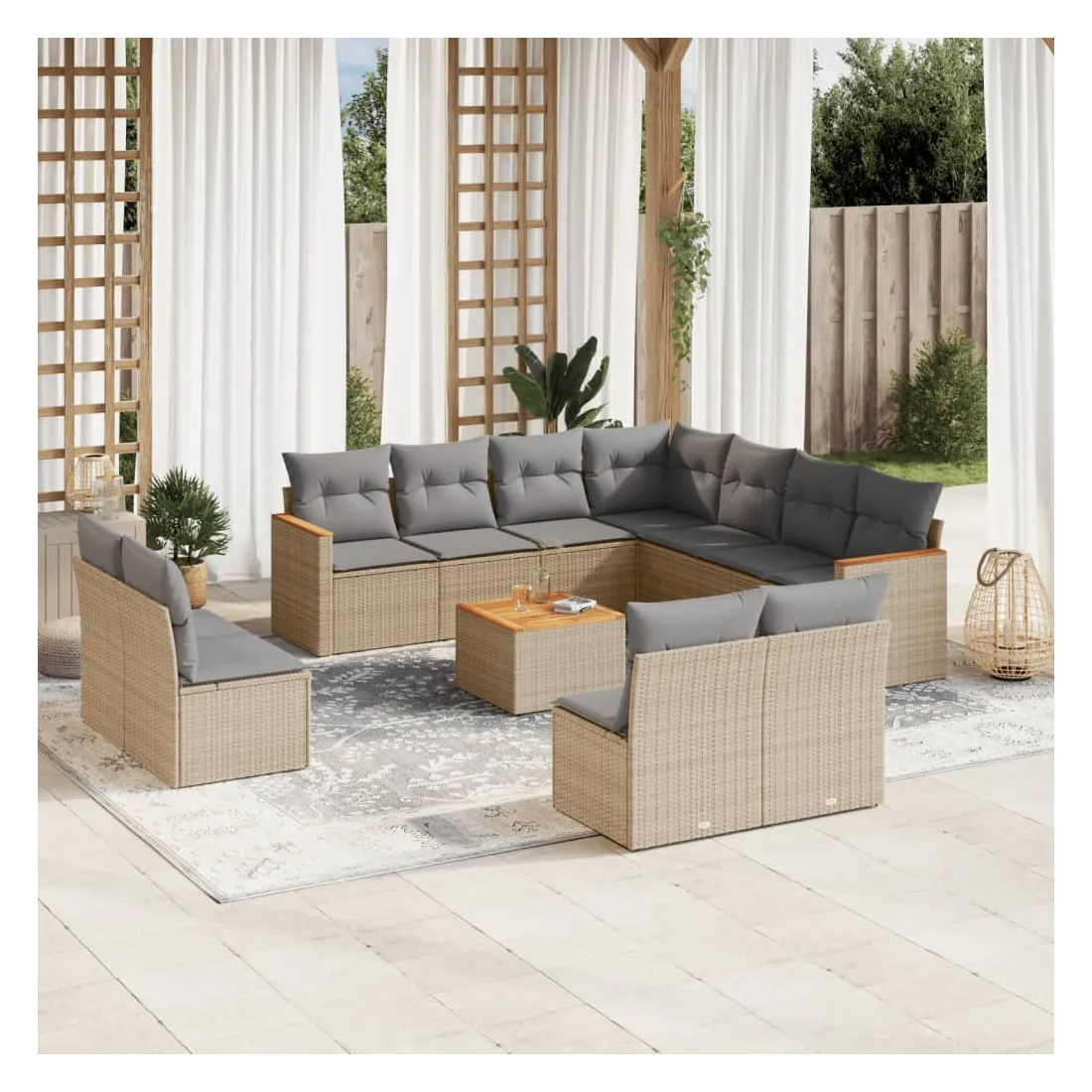 Cet ensemble de canapés de jardin est le complément parfait de votre arrière-cour, terrasse ou patio, offrant un espace confortable et accueillant pour discuter avec la famille et les amis ou simplement se détendre et profiter de l'extérieur. Matériau durable : la résine tressée, également connue sous le nom de poly rotin, est un matériau synthétique solide et nécessitant peu d'entretien qui ressemble au rotin naturel. Il est léger, facile à nettoyer et couramment utilisé pour les meubles d'extérieur en raison de sa durabilité et de ses propriétés de résistance aux intempéries.Dessus stable et facile à nettoyer : cette table de jardin a un dessus en bois d'acacia robuste, durable et facile à nettoyer avec un chiffon humide.Housse amovible et lavable : ces coussins de siège sont dotés de housses amovibles pour un lavage et un entretien faciles.Cadre robuste et stable : le cadre en acier enduit de poudre assure la solidité et la stabilité du meuble de jardin pour une utilisation quotidienne à l'extérieur.Conception modulaire : cet ensemble de meubles d'extérieur a une conception modulaire, ce qui le rend complètement flexible et facile à déplacer, afin que vous puissiez créer un agencement de meubles d'extérieur personnalisé. Bon à savoir :Pour que vos meubles d'extérieur restent beaux, nous vous recommandons de les protéger avec une housse imperméable.
