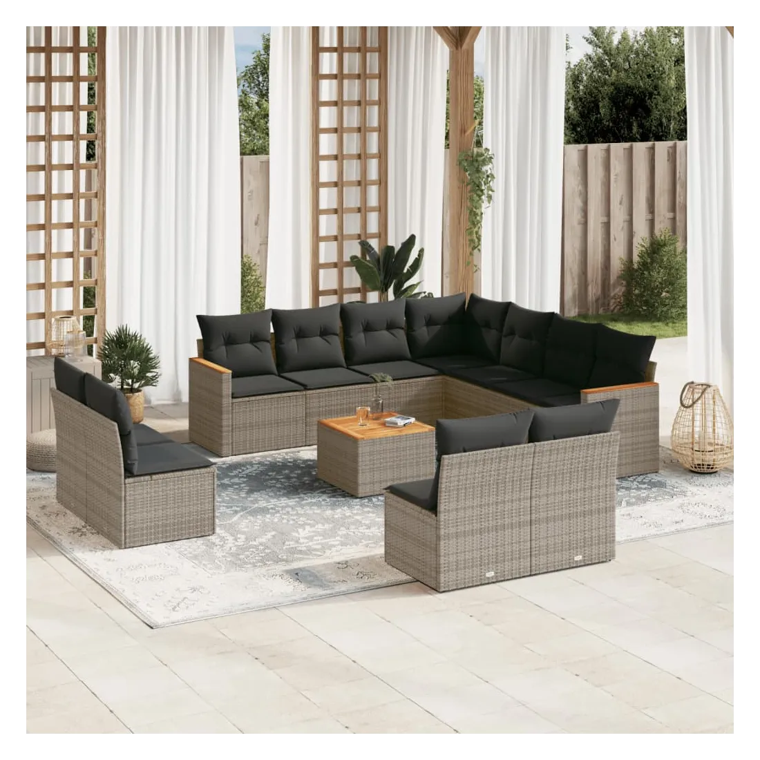 Cet ensemble de canapés de jardin est le complément parfait de votre arrière-cour, terrasse ou patio, offrant un espace confortable et accueillant pour discuter avec la famille et les amis ou simplement se détendre et profiter de l'extérieur. Matériau durable : la résine tressée, également connue sous le nom de poly rotin, est un matériau synthétique solide et nécessitant peu d'entretien qui ressemble au rotin naturel. Il est léger, facile à nettoyer et couramment utilisé pour les meubles d'extérieur en raison de sa durabilité et de ses propriétés de résistance aux intempéries.Dessus stable et facile à nettoyer : cette table de jardin a un dessus en bois d'acacia robuste, durable et facile à nettoyer avec un chiffon humide.Housse amovible et lavable : ces coussins de siège sont dotés de housses amovibles pour un lavage et un entretien faciles.Cadre robuste et stable : le cadre en acier enduit de poudre assure la solidité et la stabilité du meuble de jardin pour une utilisation quotidienne à l'extérieur.Conception modulaire : cet ensemble de meubles d'extérieur a une conception modulaire, ce qui le rend complètement flexible et facile à déplacer, afin que vous puissiez créer un agencement de meubles d'extérieur personnalisé. Bon à savoir :Pour que vos meubles d'extérieur restent beaux, nous vous recommandons de les protéger avec une housse imperméable.