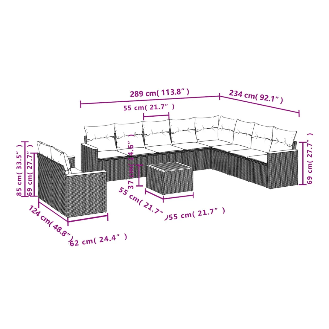 Cet ensemble de canapés de jardin est le complément parfait de votre arrière-cour, terrasse ou patio, offrant un espace confortable et accueillant pour discuter avec la famille et les amis ou simplement se détendre et profiter de l'extérieur. Matériau durable : la résine tressée, également connue sous le nom de poly rotin, est un matériau synthétique solide et nécessitant peu d'entretien qui ressemble au rotin naturel. Il est léger, facile à nettoyer et couramment utilisé pour les meubles d'extérieur en raison de sa durabilité et de ses propriétés de résistance aux intempéries.Dessus stable et facile à nettoyer : cette table de jardin a un dessus en bois d'acacia robuste, durable et facile à nettoyer avec un chiffon humide.Housse amovible et lavable : ces coussins de siège sont dotés de housses amovibles pour un lavage et un entretien faciles.Cadre robuste et stable : le cadre en acier enduit de poudre assure la solidité et la stabilité du meuble de jardin pour une utilisation quotidienne à l'extérieur.Conception modulaire : cet ensemble de meubles d'extérieur a une conception modulaire, ce qui le rend complètement flexible et facile à déplacer, afin que vous puissiez créer un agencement de meubles d'extérieur personnalisé. Bon à savoir :Pour que vos meubles d'extérieur restent beaux, nous vous recommandons de les protéger avec une housse imperméable.