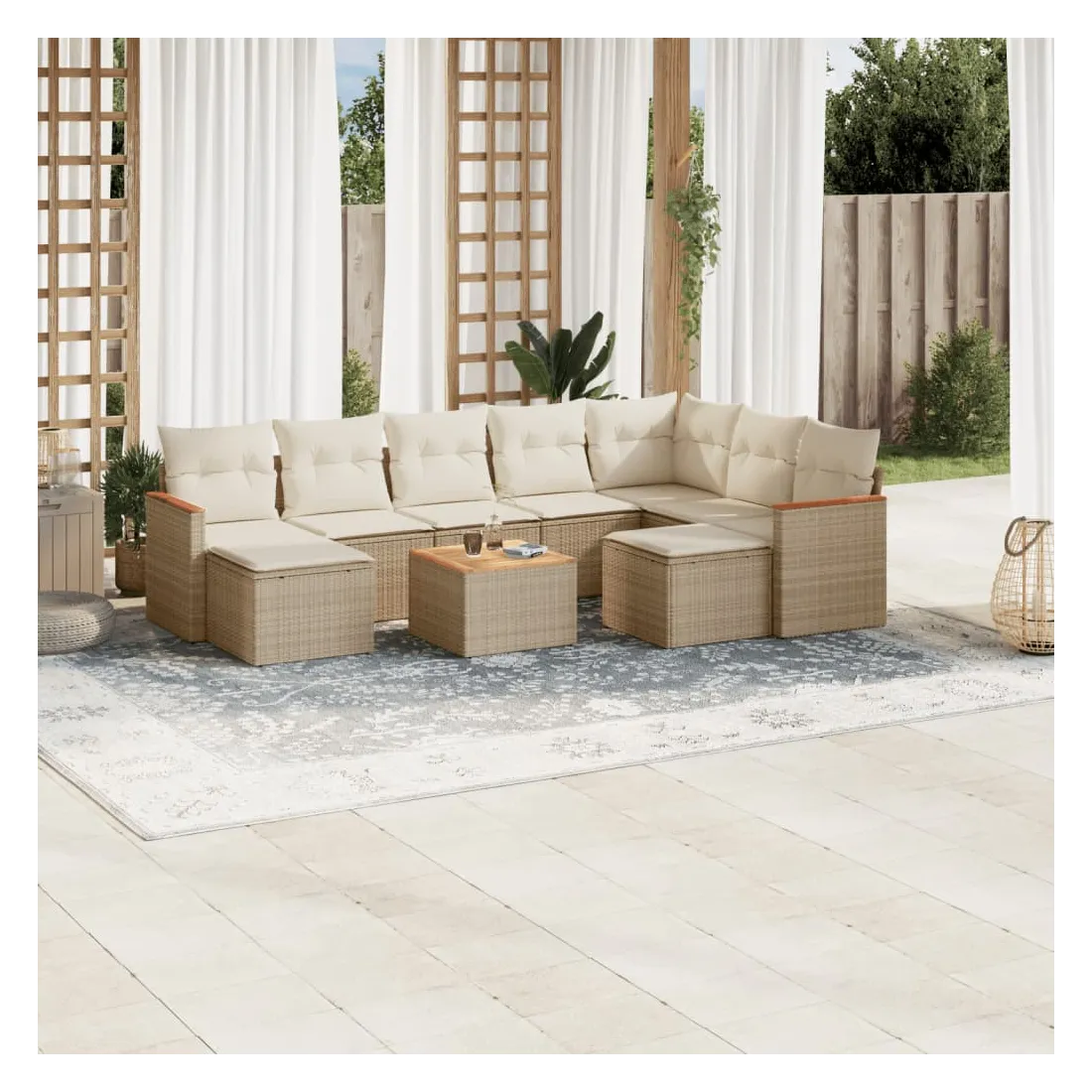 Cet ensemble de canapés de jardin est le complément parfait de votre arrière-cour, terrasse ou patio, offrant un espace confortable et accueillant pour discuter avec la famille et les amis ou simplement se détendre et profiter de l'extérieur. Matériau durable : la résine tressée, également connue sous le nom de poly rotin, est un matériau synthétique solide et nécessitant peu d'entretien qui ressemble au rotin naturel. Il est léger, facile à nettoyer et couramment utilisé pour les meubles d'extérieur en raison de sa durabilité et de ses propriétés de résistance aux intempéries.Dessus stable et facile à nettoyer : cette table de jardin a un dessus en bois d'acacia robuste, durable et facile à nettoyer avec un chiffon humide.Housse amovible et lavable : ces coussins de siège sont dotés de housses amovibles pour un lavage et un entretien faciles.Cadre robuste et stable : le cadre en acier enduit de poudre assure la solidité et la stabilité du meuble de jardin pour une utilisation quotidienne à l'extérieur.Conception modulaire : cet ensemble de meubles d'extérieur a une conception modulaire, ce qui le rend complètement flexible et facile à déplacer, afin que vous puissiez créer un agencement de meubles d'extérieur personnalisé. Bon à savoir :Pour que vos meubles d'extérieur restent beaux, nous vous recommandons de les protéger avec une housse imperméable.