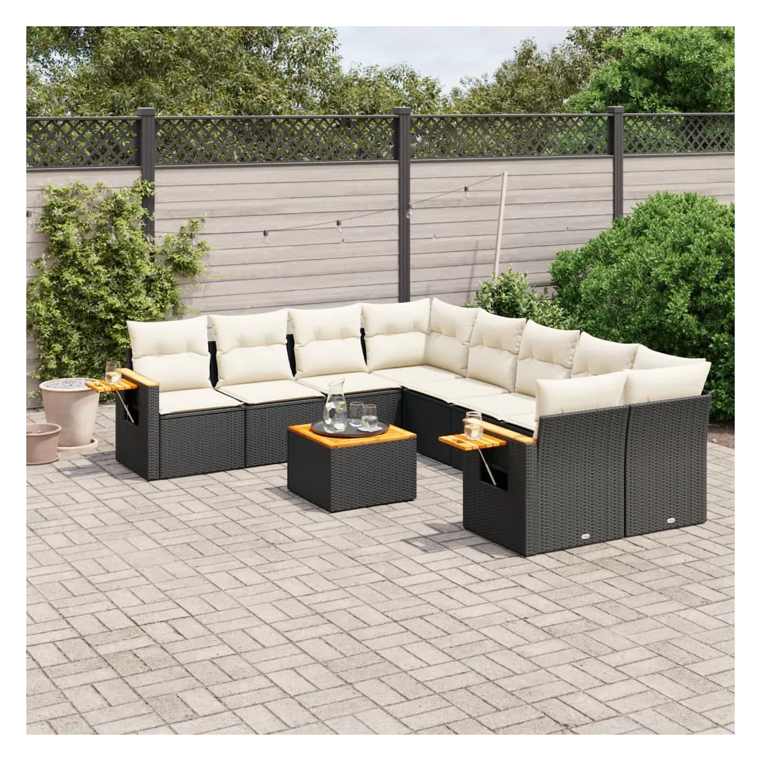 Cet ensemble de canapés de jardin est le complément parfait de votre arrière-cour, terrasse ou patio, offrant un espace confortable et accueillant pour discuter avec la famille et les amis ou simplement se détendre et profiter de l'extérieur. Matériau durable : la résine tressée, également connue sous le nom de poly rotin, est un matériau synthétique solide et nécessitant peu d'entretien qui ressemble au rotin naturel. Il est léger, facile à nettoyer et couramment utilisé pour les meubles d'extérieur en raison de sa durabilité et de ses propriétés de résistance aux intempéries.Dessus stable et facile à nettoyer : cette table de jardin a un dessus en bois d'acacia robuste, durable et facile à nettoyer avec un chiffon humide.Table d'appoint pratique : ce mobilier d'extérieur comprend une table d'appoint pliable avec un ressort à gaz sur les accoudoirs, offrant un endroit pratique pour garder vos essentiels à portée de main.Housse amovible et lavable : ces coussins de siège sont dotés de housses amovibles pour un lavage et un entretien faciles.Conception modulaire : cet ensemble de meubles d'extérieur a une conception modulaire, ce qui le rend complètement flexible et facile à déplacer, afin que vous puissiez créer un agencement de meubles d'extérieur personnalisé. Bon à savoir :Pour que vos meubles d'extérieur restent beaux, nous vous recommandons de les protéger avec une housse imperméable.
