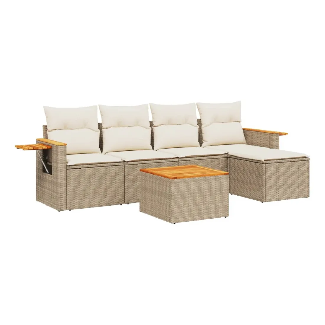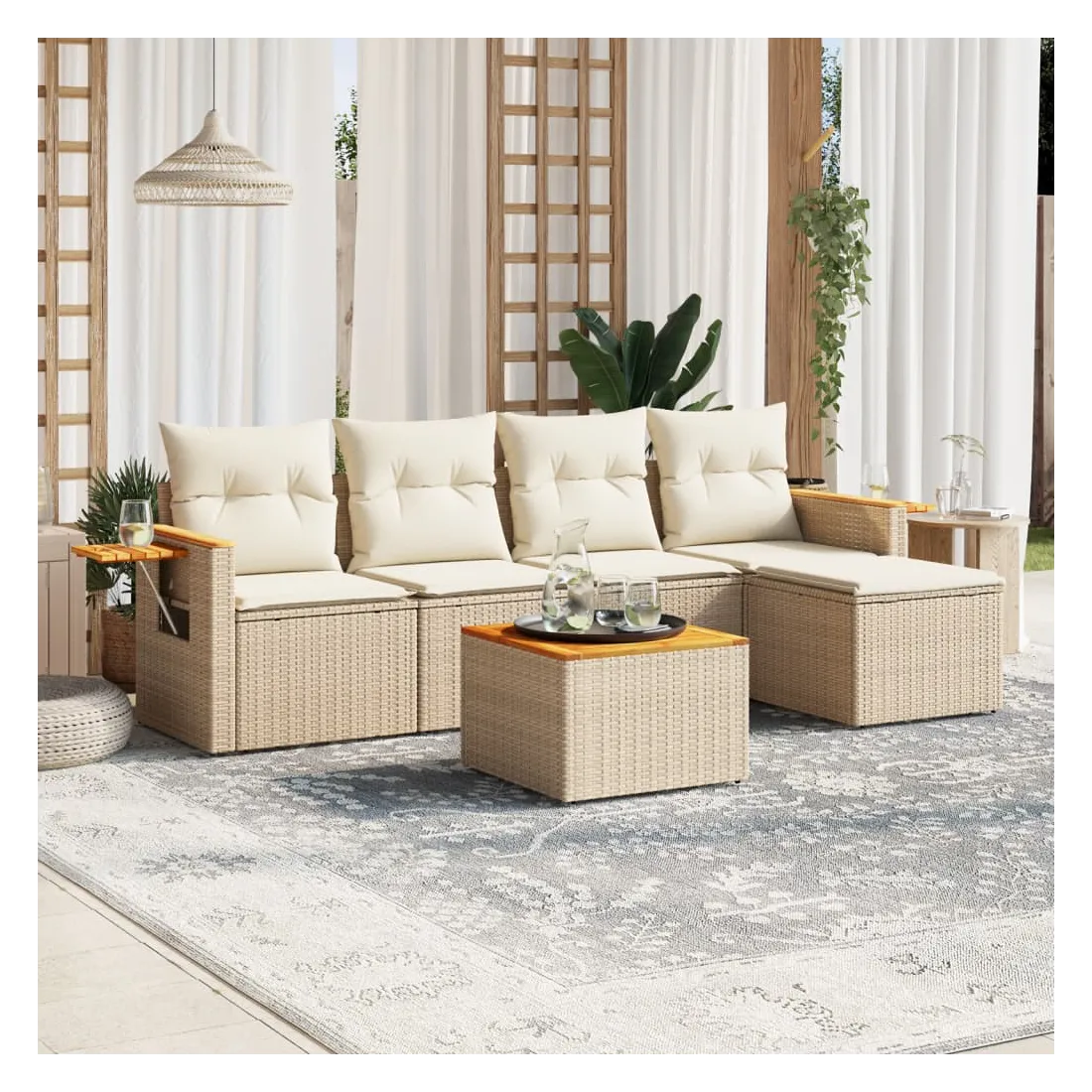 Cet ensemble de canapés de jardin est le complément parfait de votre arrière-cour, terrasse ou patio, offrant un espace confortable et accueillant pour discuter avec la famille et les amis ou simplement se détendre et profiter de l'extérieur. Matériau durable : la résine tressée, également connue sous le nom de poly rotin, est un matériau synthétique solide et nécessitant peu d'entretien qui ressemble au rotin naturel. Il est léger, facile à nettoyer et couramment utilisé pour les meubles d'extérieur en raison de sa durabilité et de ses propriétés de résistance aux intempéries.Dessus stable et facile à nettoyer : cette table de jardin a un dessus en bois d'acacia robuste, durable et facile à nettoyer avec un chiffon humide.Table d'appoint pratique : ce mobilier d'extérieur comprend une table d'appoint pliable avec un ressort à gaz sur les accoudoirs, offrant un endroit pratique pour garder vos essentiels à portée de main.Housse amovible et lavable : ces coussins de siège sont dotés de housses amovibles pour un lavage et un entretien faciles.Conception modulaire : cet ensemble de meubles d'extérieur a une conception modulaire, ce qui le rend complètement flexible et facile à déplacer, afin que vous puissiez créer un agencement de meubles d'extérieur personnalisé. Bon à savoir :Pour que vos meubles d'extérieur restent beaux, nous vous recommandons de les protéger avec une housse imperméable.