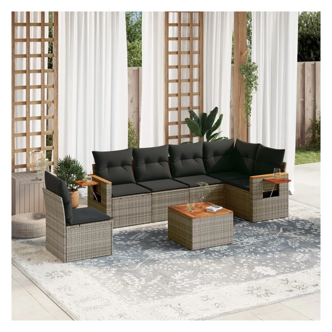 Cet ensemble de canapés de jardin est le complément parfait de votre arrière-cour, terrasse ou patio, offrant un espace confortable et accueillant pour discuter avec la famille et les amis ou simplement se détendre et profiter de l'extérieur. Matériau durable : la résine tressée, également connue sous le nom de poly rotin, est un matériau synthétique solide et nécessitant peu d'entretien qui ressemble au rotin naturel. Il est léger, facile à nettoyer et couramment utilisé pour les meubles d'extérieur en raison de sa durabilité et de ses propriétés de résistance aux intempéries.Dessus stable et facile à nettoyer : cette table de jardin a un dessus en bois d'acacia robuste, durable et facile à nettoyer avec un chiffon humide.Table d'appoint pratique : ce mobilier d'extérieur comprend une table d'appoint pliable avec un ressort à gaz sur les accoudoirs, offrant un endroit pratique pour garder vos essentiels à portée de main.Housse amovible et lavable : ces coussins de siège sont dotés de housses amovibles pour un lavage et un entretien faciles.Conception modulaire : cet ensemble de meubles d'extérieur a une conception modulaire, ce qui le rend complètement flexible et facile à déplacer, afin que vous puissiez créer un agencement de meubles d'extérieur personnalisé. Bon à savoir :Pour que vos meubles d'extérieur restent beaux, nous vous recommandons de les protéger avec une housse imperméable.