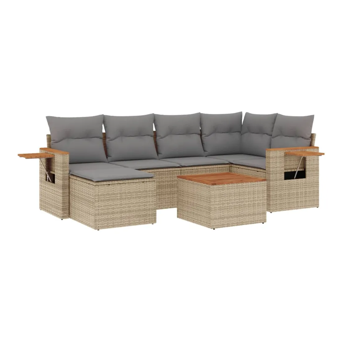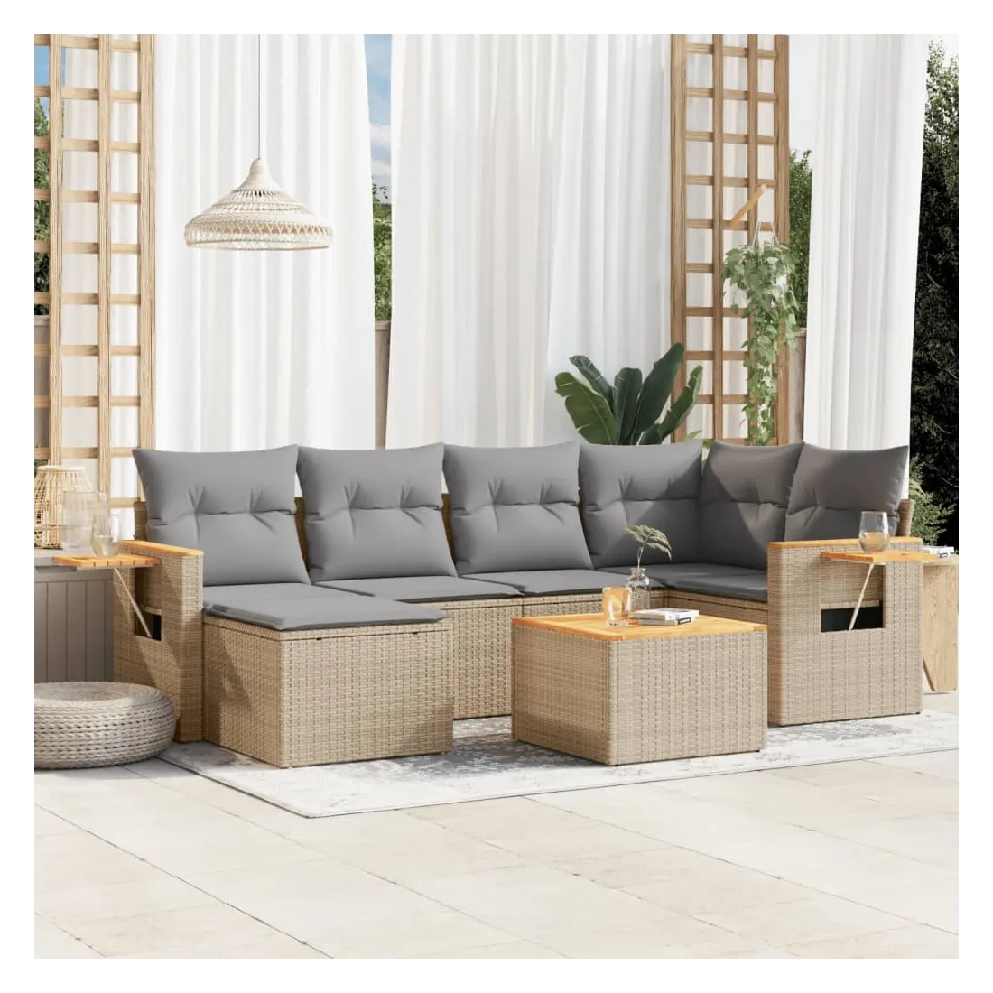 Cet ensemble de canapés de jardin est le complément parfait de votre arrière-cour, terrasse ou patio, offrant un espace confortable et accueillant pour discuter avec la famille et les amis ou simplement se détendre et profiter de l'extérieur. Matériau durable : la résine tressée, également connue sous le nom de poly rotin, est un matériau synthétique solide et nécessitant peu d'entretien qui ressemble au rotin naturel. Il est léger, facile à nettoyer et couramment utilisé pour les meubles d'extérieur en raison de sa durabilité et de ses propriétés de résistance aux intempéries.Dessus stable et facile à nettoyer : cette table de jardin a un dessus en bois d'acacia robuste, durable et facile à nettoyer avec un chiffon humide.Table d'appoint pratique : ce mobilier d'extérieur comprend une table d'appoint pliable avec un ressort à gaz sur les accoudoirs, offrant un endroit pratique pour garder vos essentiels à portée de main.Housse amovible et lavable : ces coussins de siège sont dotés de housses amovibles pour un lavage et un entretien faciles.Conception modulaire : cet ensemble de meubles d'extérieur a une conception modulaire, ce qui le rend complètement flexible et facile à déplacer, afin que vous puissiez créer un agencement de meubles d'extérieur personnalisé. Bon à savoir :Pour que vos meubles d'extérieur restent beaux, nous vous recommandons de les protéger avec une housse imperméable.