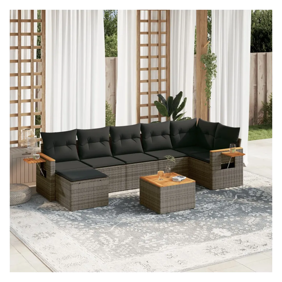 Cet ensemble de canapés de jardin est le complément parfait de votre arrière-cour, terrasse ou patio, offrant un espace confortable et accueillant pour discuter avec la famille et les amis ou simplement se détendre et profiter de l'extérieur. Matériau durable : la résine tressée, également connue sous le nom de poly rotin, est un matériau synthétique solide et nécessitant peu d'entretien qui ressemble au rotin naturel. Il est léger, facile à nettoyer et couramment utilisé pour les meubles d'extérieur en raison de sa durabilité et de ses propriétés de résistance aux intempéries.Dessus stable et facile à nettoyer : cette table de jardin a un dessus en bois d'acacia robuste, durable et facile à nettoyer avec un chiffon humide.Table d'appoint pratique : ce mobilier d'extérieur comprend une table d'appoint pliable avec un ressort à gaz sur les accoudoirs, offrant un endroit pratique pour garder vos essentiels à portée de main.Housse amovible et lavable : ces coussins de siège sont dotés de housses amovibles pour un lavage et un entretien faciles.Conception modulaire : cet ensemble de meubles d'extérieur a une conception modulaire, ce qui le rend complètement flexible et facile à déplacer, afin que vous puissiez créer un agencement de meubles d'extérieur personnalisé. Bon à savoir :Pour que vos meubles d'extérieur restent beaux, nous vous recommandons de les protéger avec une housse imperméable.