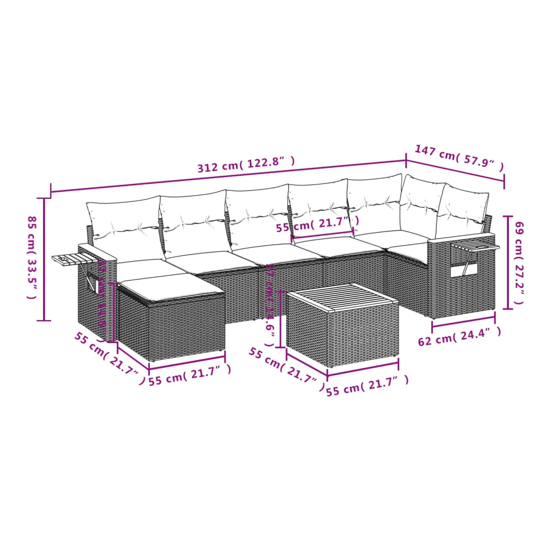 • 7 x coussin de siège avec housse amovible et lavable