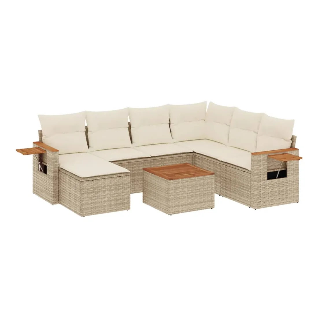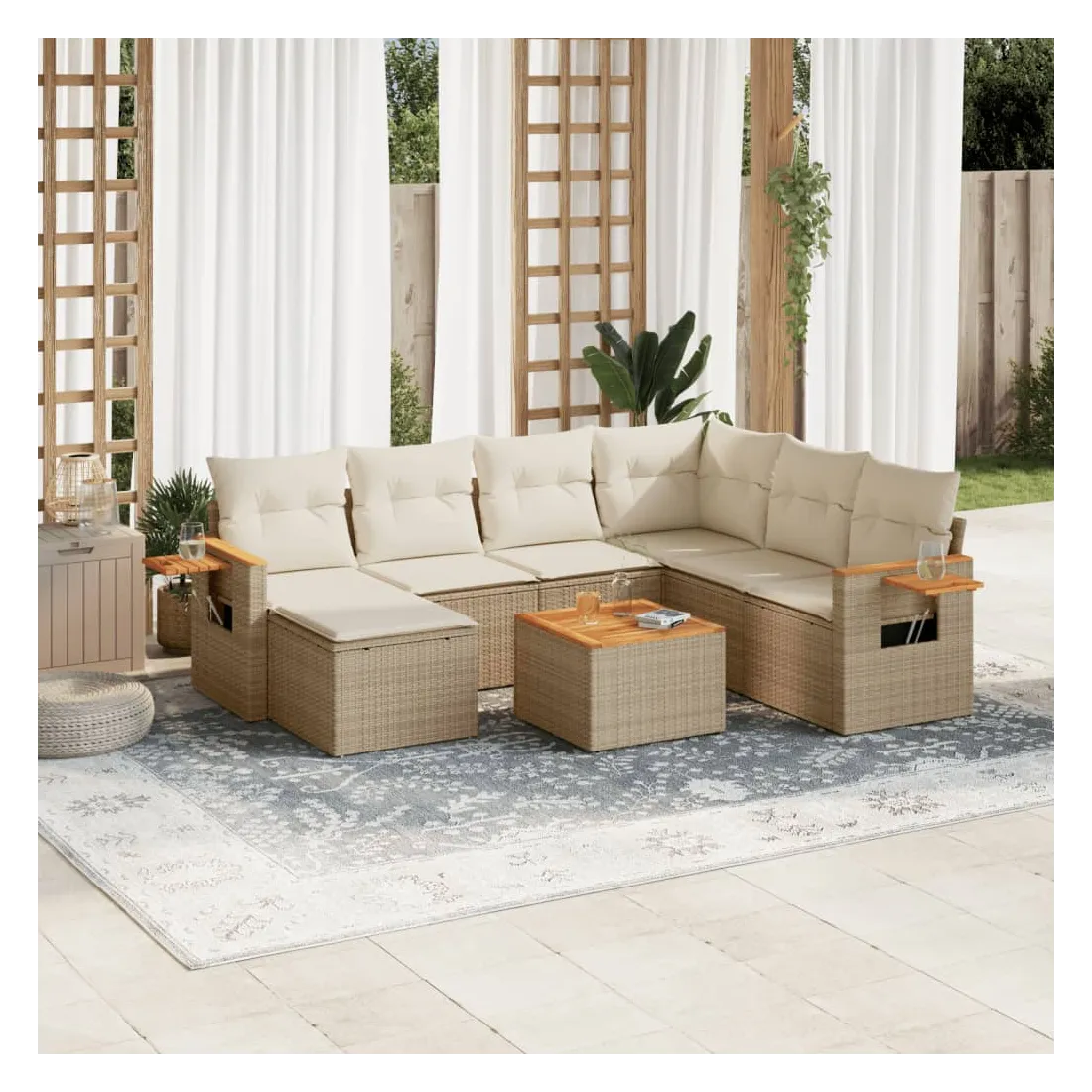 Cet ensemble de canapés de jardin est le complément parfait de votre arrière-cour, terrasse ou patio, offrant un espace confortable et accueillant pour discuter avec la famille et les amis ou simplement se détendre et profiter de l'extérieur. Matériau durable : la résine tressée, également connue sous le nom de poly rotin, est un matériau synthétique solide et nécessitant peu d'entretien qui ressemble au rotin naturel. Il est léger, facile à nettoyer et couramment utilisé pour les meubles d'extérieur en raison de sa durabilité et de ses propriétés de résistance aux intempéries.Dessus stable et facile à nettoyer : cette table de jardin a un dessus en bois d'acacia robuste, durable et facile à nettoyer avec un chiffon humide.Table d'appoint pratique : ce mobilier d'extérieur comprend une table d'appoint pliable avec un ressort à gaz sur les accoudoirs, offrant un endroit pratique pour garder vos essentiels à portée de main.Housse amovible et lavable : ces coussins de siège sont dotés de housses amovibles pour un lavage et un entretien faciles.Conception modulaire : cet ensemble de meubles d'extérieur a une conception modulaire, ce qui le rend complètement flexible et facile à déplacer, afin que vous puissiez créer un agencement de meubles d'extérieur personnalisé. Bon à savoir :Pour que vos meubles d'extérieur restent beaux, nous vous recommandons de les protéger avec une housse imperméable.