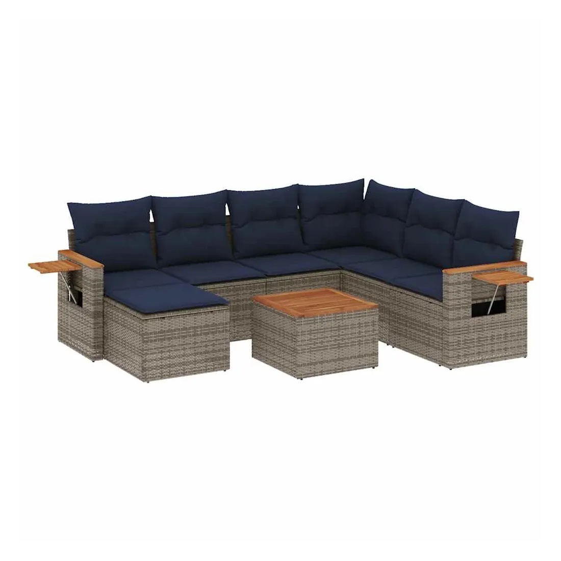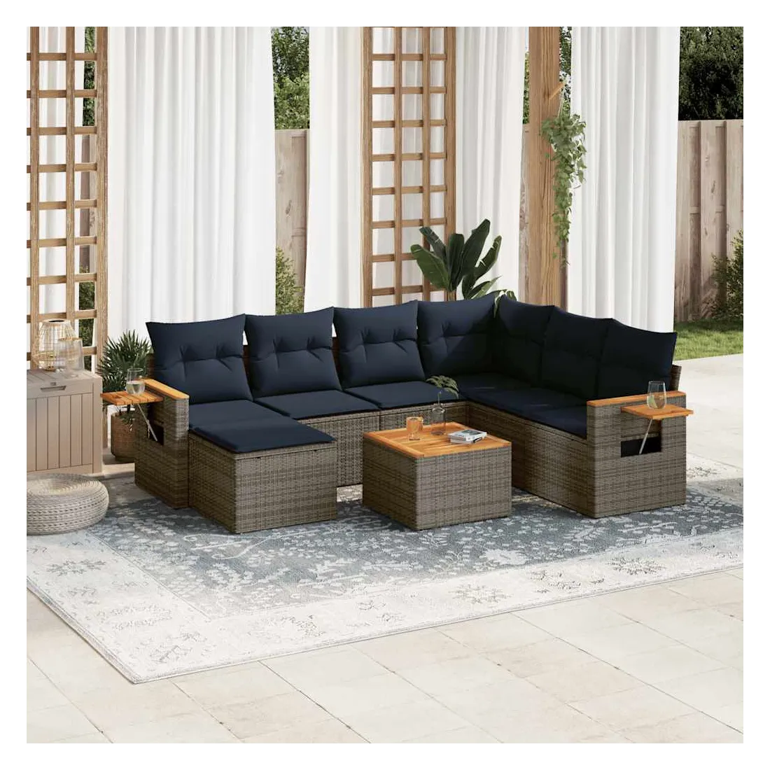 Cet ensemble de canapés de jardin est le complément parfait de votre arrière-cour, terrasse ou patio, offrant un espace confortable et accueillant pour discuter avec la famille et les amis ou simplement se détendre et profiter de l'extérieur. Matériau durable : la résine tressée, également connue sous le nom de poly rotin, est un matériau synthétique solide et nécessitant peu d'entretien qui ressemble au rotin naturel. Il est léger, facile à nettoyer et couramment utilisé pour les meubles d'extérieur en raison de sa durabilité et de ses propriétés de résistance aux intempéries.Dessus stable et facile à nettoyer : cette table de jardin a un dessus en bois d'acacia robuste, durable et facile à nettoyer avec un chiffon humide.Table d'appoint pratique : ce mobilier d'extérieur comprend une table d'appoint pliable avec un ressort à gaz sur les accoudoirs, offrant un endroit pratique pour garder vos essentiels à portée de main.Housse amovible et lavable : ces coussins de siège sont dotés de housses amovibles pour un lavage et un entretien faciles.Conception modulaire : cet ensemble de meubles d'extérieur a une conception modulaire, ce qui le rend complètement flexible et facile à déplacer, afin que vous puissiez créer un agencement de meubles d'extérieur personnalisé. Bon à savoir :Pour que vos meubles d'extérieur restent beaux, nous vous recommandons de les protéger avec une housse imperméable.