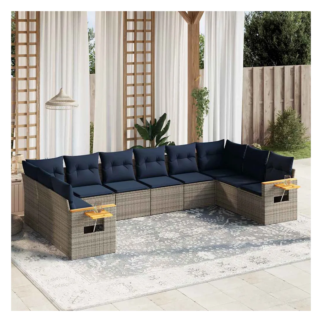Cet ensemble de canapés de jardin est le complément parfait de votre arrière-cour, terrasse ou patio, offrant un espace confortable et accueillant pour discuter avec la famille et les amis ou simplement se détendre et profiter de l'extérieur. Matériau durable : la résine tressée, également connue sous le nom de poly rotin, est un matériau synthétique solide et nécessitant peu d'entretien qui ressemble au rotin naturel. Il est léger, facile à nettoyer et couramment utilisé pour les meubles d'extérieur en raison de sa durabilité et de ses propriétés de résistance aux intempéries.Table d'appoint pratique : ce mobilier d'extérieur comprend une table d'appoint pliable avec un ressort à gaz sur les accoudoirs, offrant un endroit pratique pour garder vos essentiels à portée de main.Housse amovible et lavable : ces coussins de siège sont dotés de housses amovibles pour un lavage et un entretien faciles.Conception modulaire : cet ensemble de meubles d'extérieur a une conception modulaire, ce qui le rend complètement flexible et facile à déplacer, afin que vous puissiez créer un agencement de meubles d'extérieur personnalisé. Bon à savoir :Pour que vos meubles d'extérieur restent beaux, nous vous recommandons de les protéger avec une housse imperméable.